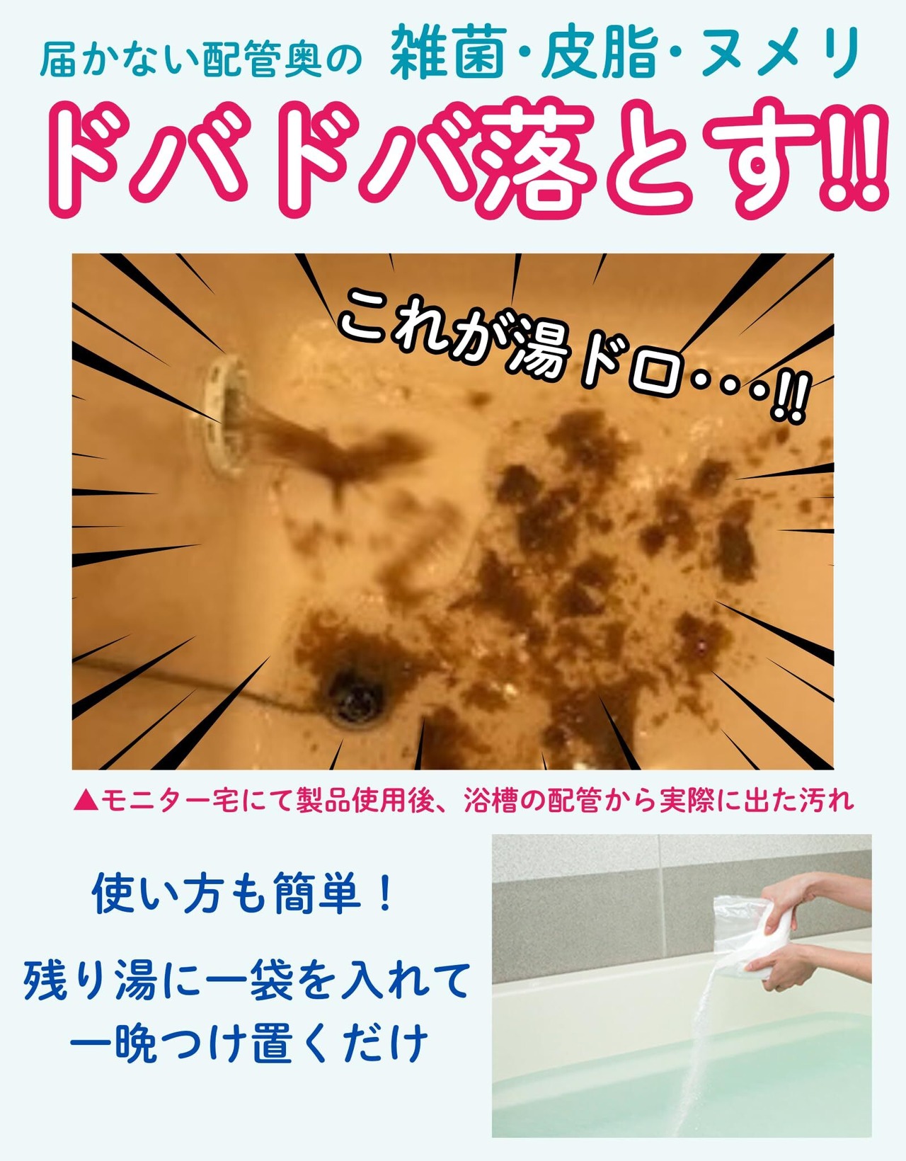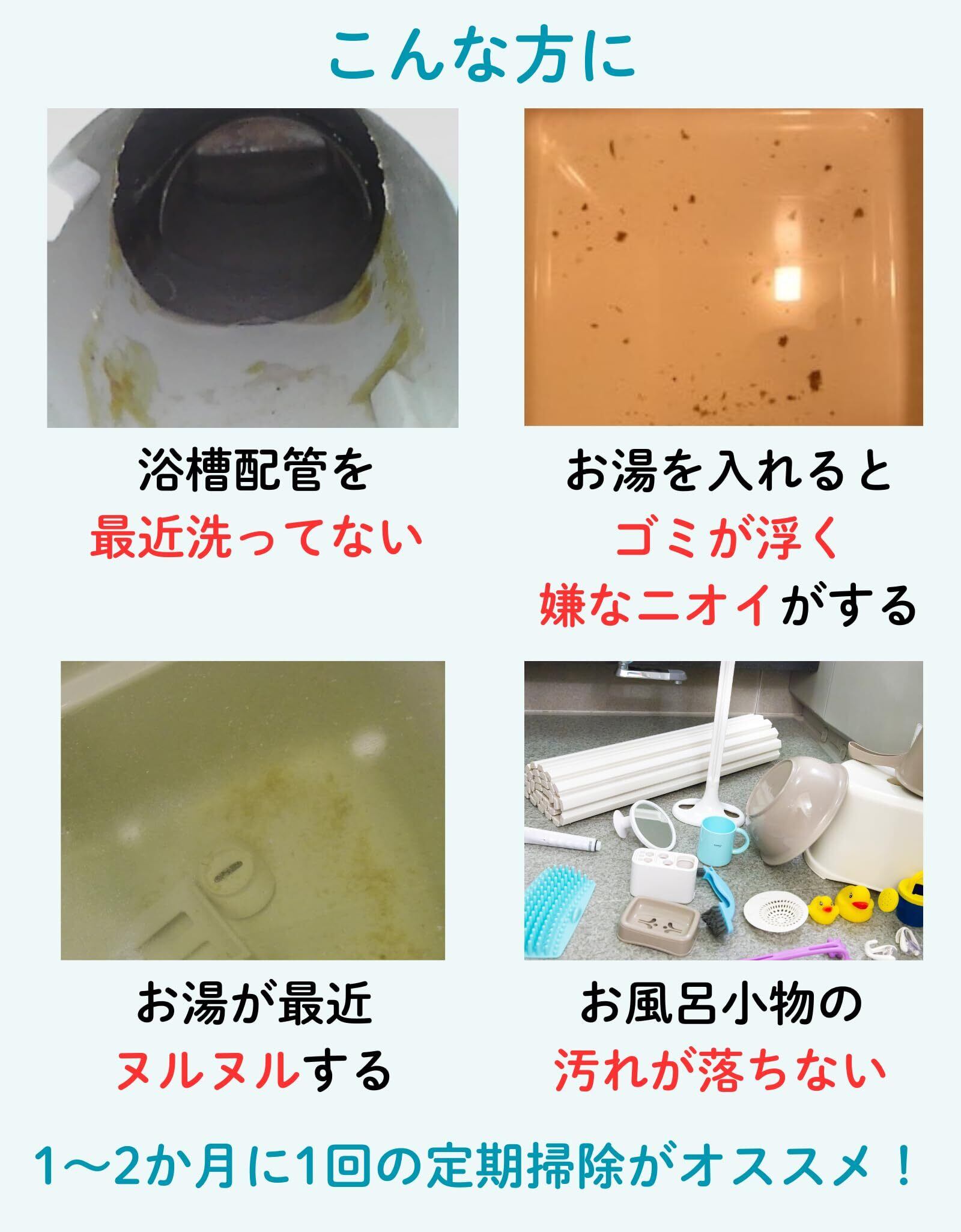 【寝ている間につけ置き掃除】 残り湯に入れて、つけおくだけで洗浄完了!こすらなくていいので手軽。定期的に使うことで、日々のお掃除の負担を軽減します。