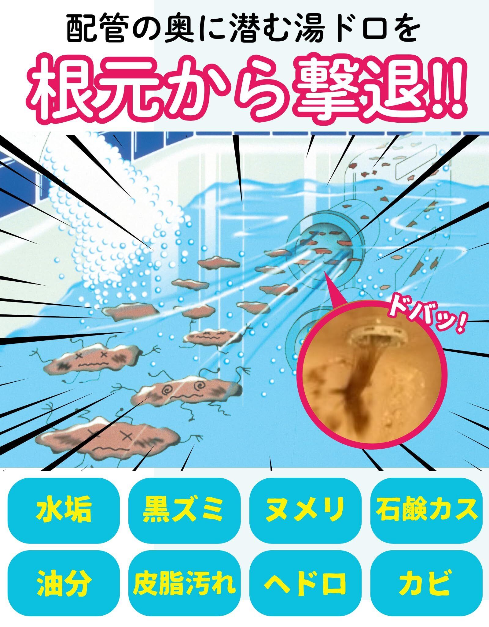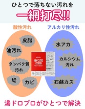 【プロが使うお風呂洗剤がおうちでも】 お風呂には皮脂、たんぱく質、カビ、水垢、カルキ汚れ、石鹸カスなどさまざまな汚れがあります。一般的な洗剤は汚れによって使い分けが必要ですが、湯ドロプロは残り湯に一晩つけ置くだけ。プロも愛用する風呂釜洗浄剤で小物も風呂釜も浴槽も一気にピカピカに洗浄します。