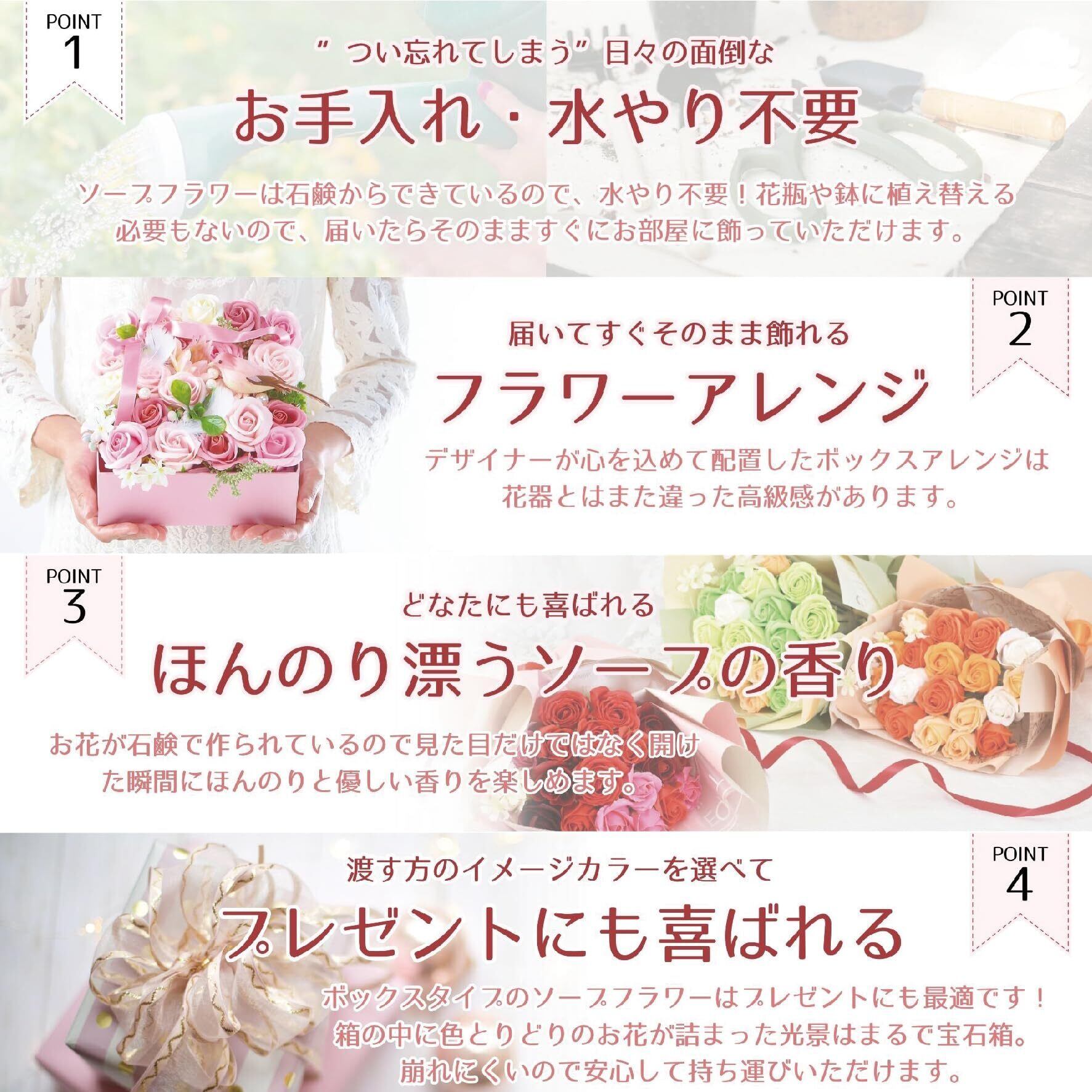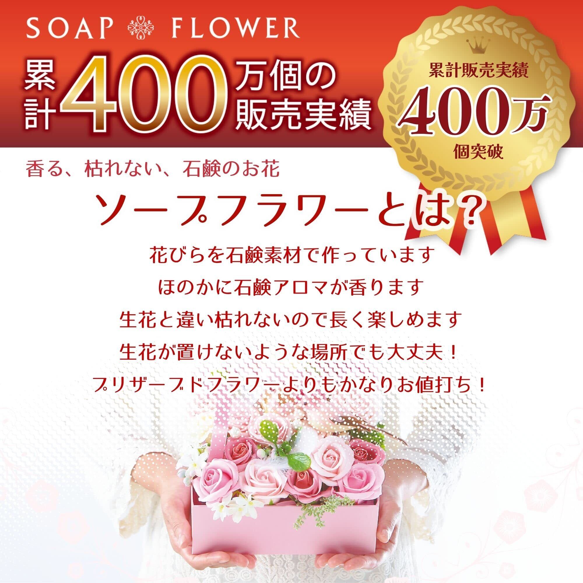 【ソープフラワーの特徴】花びら1枚1枚が石けん素材で作られた観賞用のお花です。プリザーブドフラワーと比べて花弁が大きく、値段がお手頃、石けんのいい匂いがふんわりと香るので人気があります。 生花のように水やりやお手入れの必要がなく、枯れる心配も虫や花粉の心配もありません。