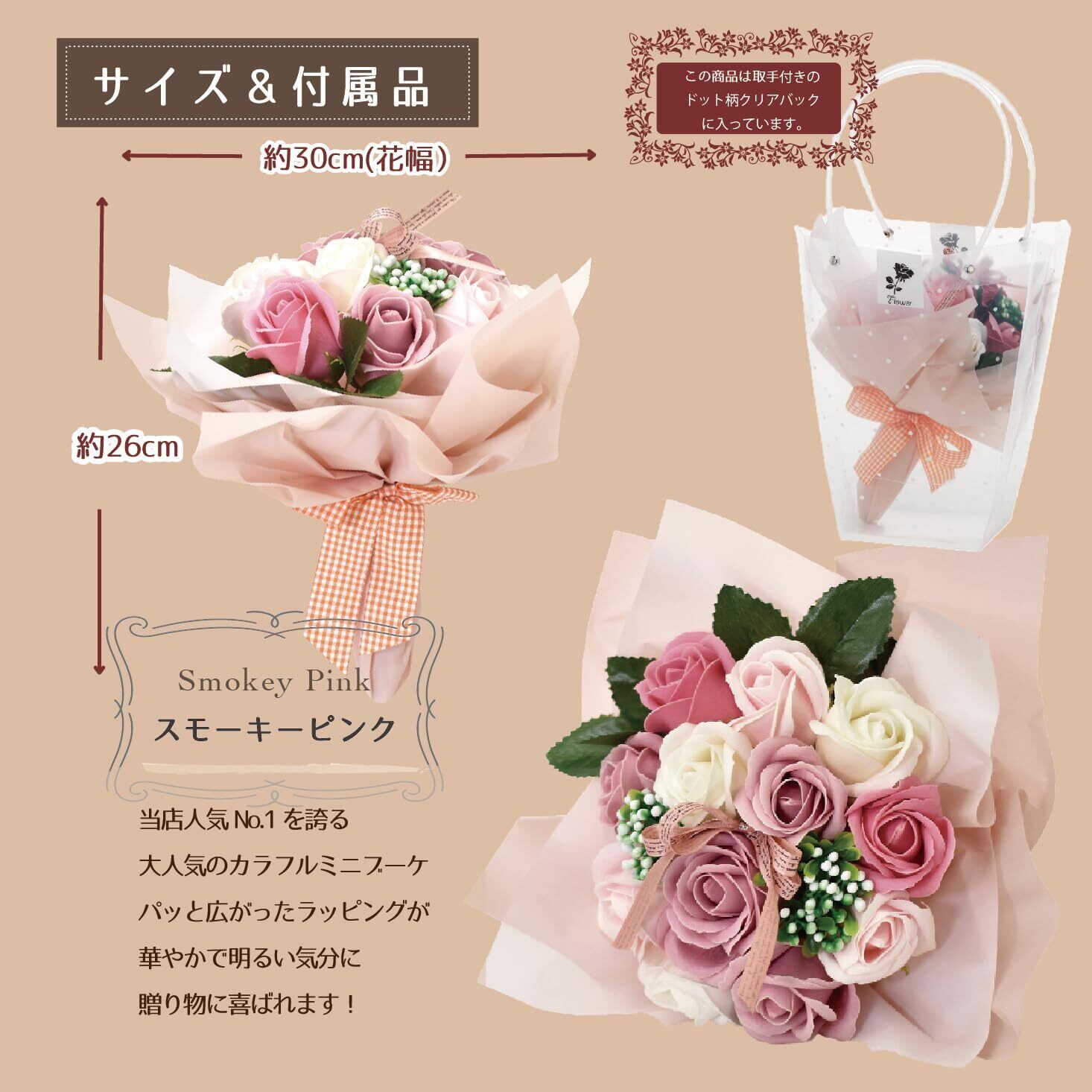 ポピー名古屋 ソープフラワー シャボンフラワー 造花 ギフト プレゼント 12輪ブーケ バラ 花束 約26cm クリアバッグ付き SBL-11 スモーキーピンク
