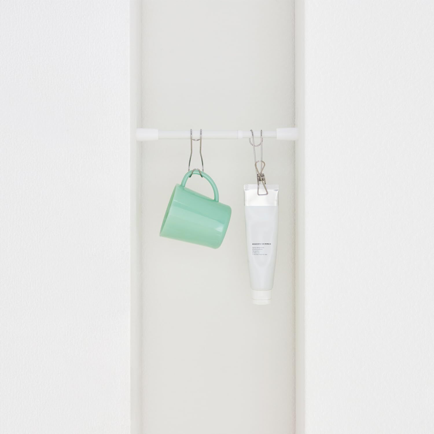 20cmから設置可能なミニサイズのつっぱり棒。わずかな隙間にもハンガーやS字フックを掛けて収納をプラスできる。