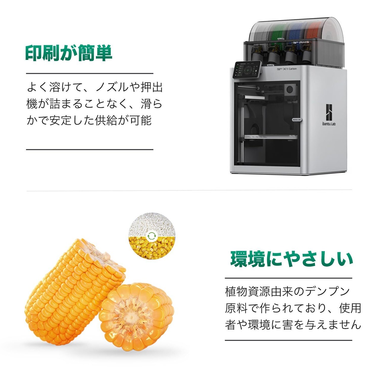 【エコな材質】環境に優しいPLA材質で無毒・匂い無し、造形した物は子供へにもオケです。100%環境に配慮した製品、潜在的に有害な物質を一切含まない。室内でのプリントには理想的な製品です。スプールを分離して再利用することはできません。