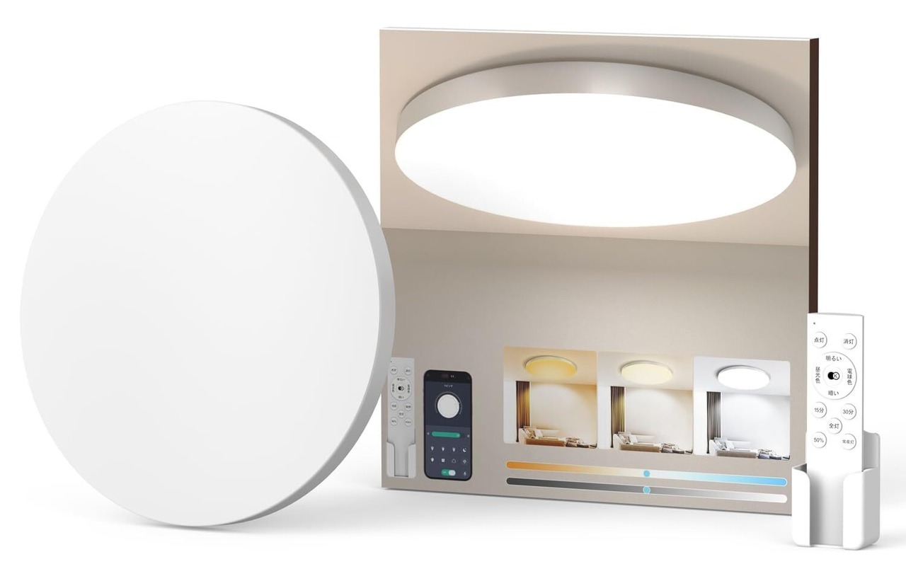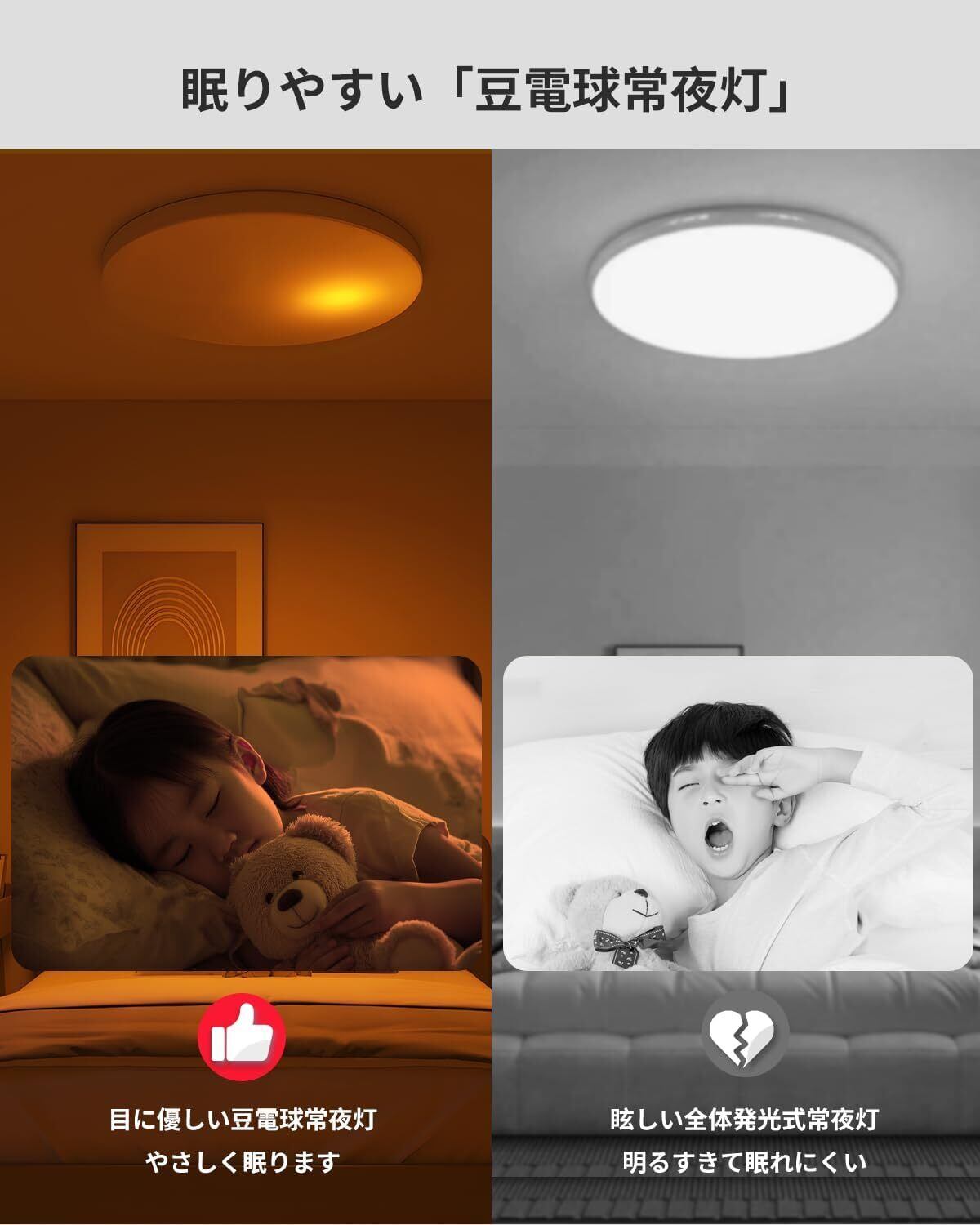 【豆電球常夜灯・記憶機能・定刻消灯】○本格的な豆電球常夜灯(1W):他社の眩しい全体発光式常夜灯と違って、1点だけ発光のため、ちょうどいい感じの暗さで目への刺激がなく、付けまま寝ることに最適です。○進化した記憶機能:他社の記憶機能は常夜灯によって前の設定がリセットされる方が多く、当天井照明器具はいろいろ設定してから常夜灯を使っても、次回点灯時にきちんと常夜灯前の設定を再現しますので、設定がリセットされるため毎日設定し直しの悩みがなくなります!○消灯機能:設定して15/30分後自動的に消灯するため、消し忘れの心配はありません。