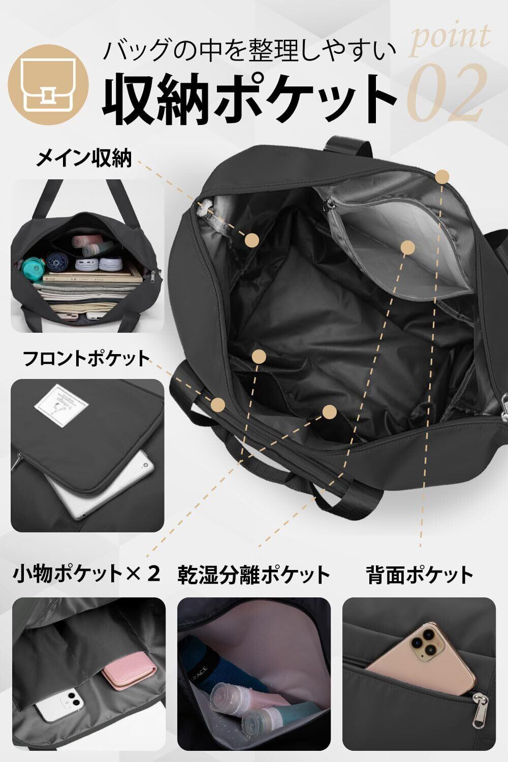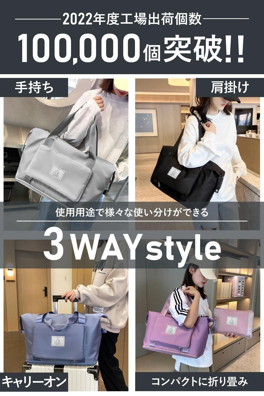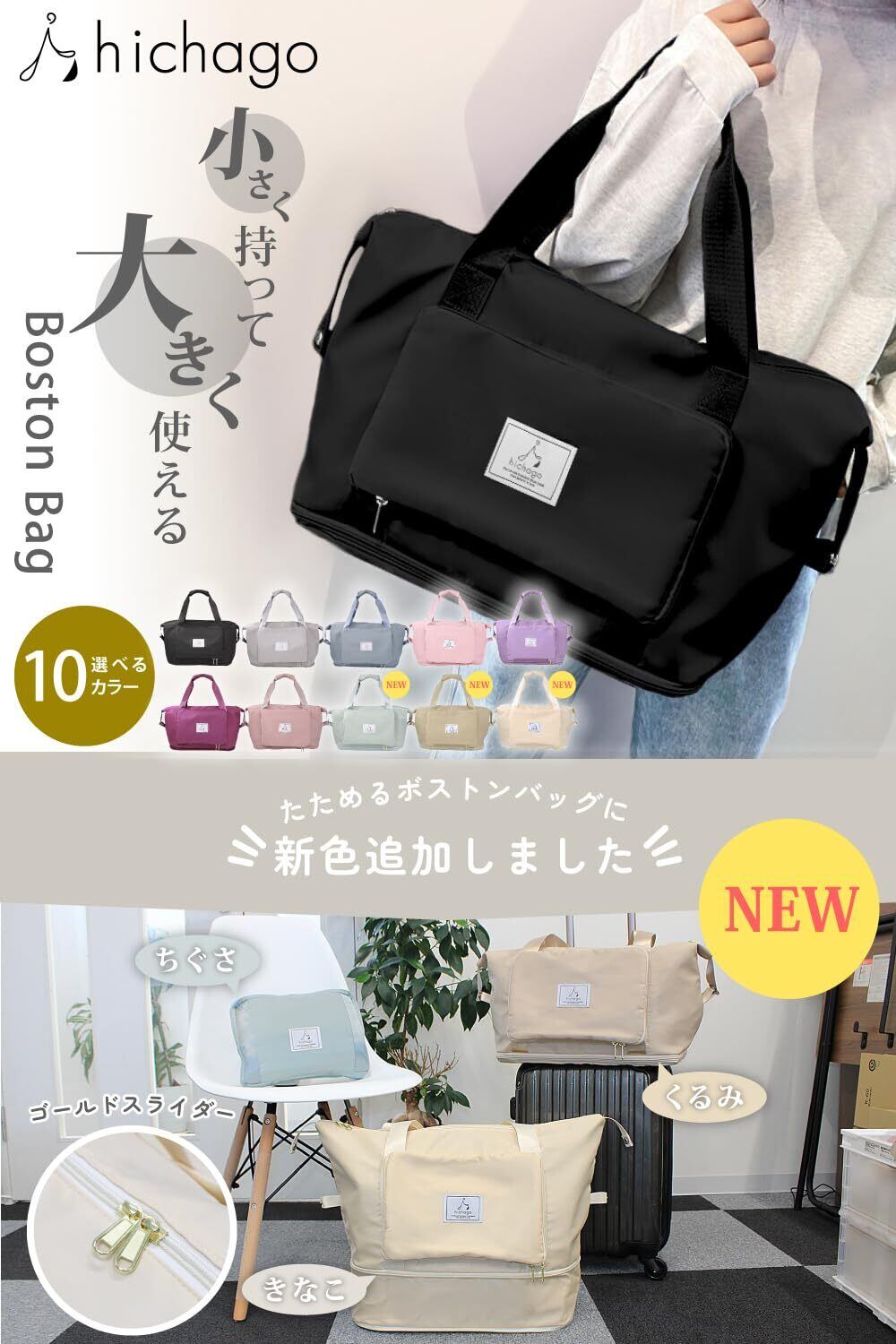 hichago ボストンバッグ 【折りたためる】 大容量 拡張 軽量 旅行 修学旅行 メンズ レディース キャリーオンバッグ サブバッグ