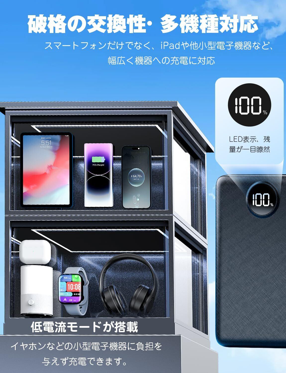 ️【LED電池残量表示・自動検知IC機能】 本体にLED液晶ディスプレイを搭載しており、残量を1%刻みで表示できるので、ボタンを押すと電池残量が一目で確認できます。充電のタイミングを把握するのに便利で、使うときにバッテリーの残量が無いといった不安を解消します。独自技術Smart IC知能検知機能により、接続されたデバイスに合わせて自動的に出力を判別してパワーの調整を行い、充電が完了したら自動でストップ、異なるデバイスでも安全かつ効率的な充電が可能になります。また、低電流モードも搭載されており、ワイヤレスイヤホンやスマートウォッチなどの小型電子機器を充電する際に、適切な出力を自動的に変えることができます。小型電子機器に負担を与えず、より安全に充電できます。(※低電流モードのon / offの詳細は説明書をご覧ください。)
