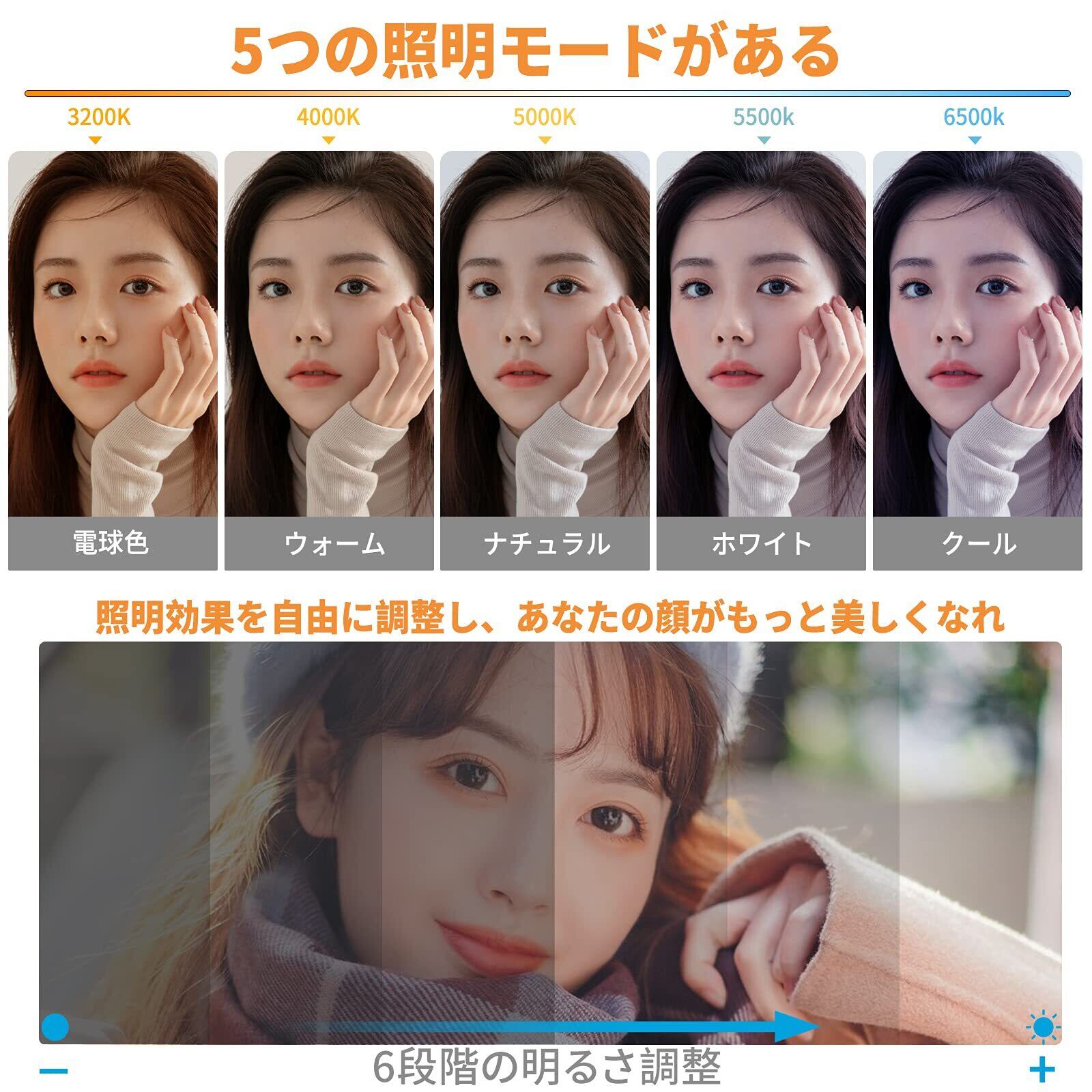 【お似合う五色モード·細かく調光可能】kimwoodは何千人もの人の肌をスキャンし、アジア人に最も適した五色モードのLedリングライトを開発されました。リングライトは色温度は3200Kから6500Kまで、環境や気分によって好きな照明の色合いを切り替えます。明るさは細かく調整することで不自然な白飛びを防ぐことが出来て驚きの美肌効果を発揮し、女優にように美しく綺麗に撮影録画することが出来ます。