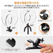 【多場面適用】インタネット時代では、オンラインミーティング/面接/授業、ライブ配信、Line通話の機会が増えており、明るすぎたり暗すぎたりすると目に負担がかかります。こちらのオンライン用ライトは柔らかな照明で目を保護、紫外線による肌へのダメージを減少、長時間使用してもお体に危害が出さない。電子機器をよく使う人にとっては持っておいて損はない商品だと思います。クリップ式+三脚なのでどこでも使え、リモート用ライトとしてだけでなく、自撮りライト、女優ライト、生放送用ライトとしても最適、いろんな場面でしっかり照明。