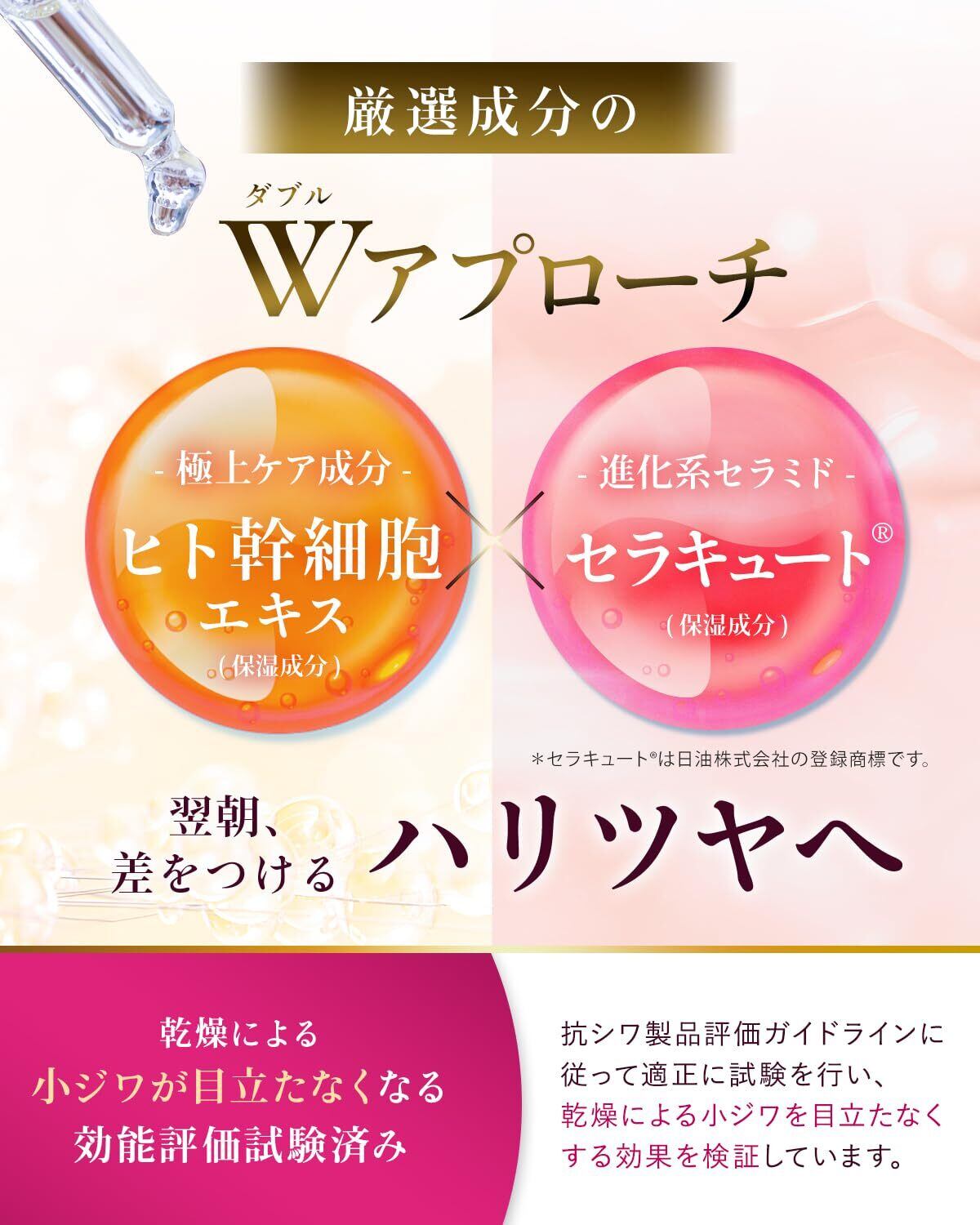 【ハリとツヤのある目元に】極上スキンケア成分「ヒト幹細胞エキス(保湿成分)」に加え、 セラミドよりも細かい構造でピッタリ密着&高保湿を可能とした「セラキュート(保湿成分)」をプラス。極上の目元ケアでハリとツヤのある肌へと導きます。