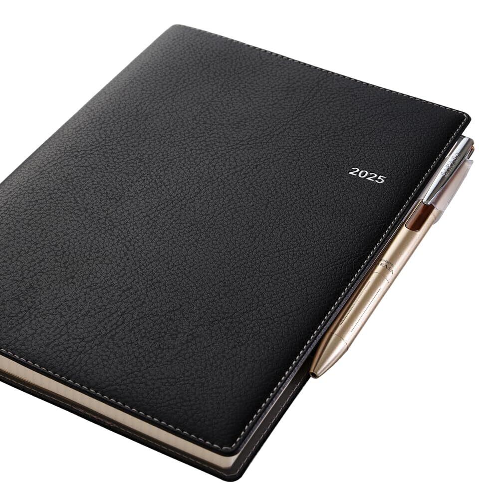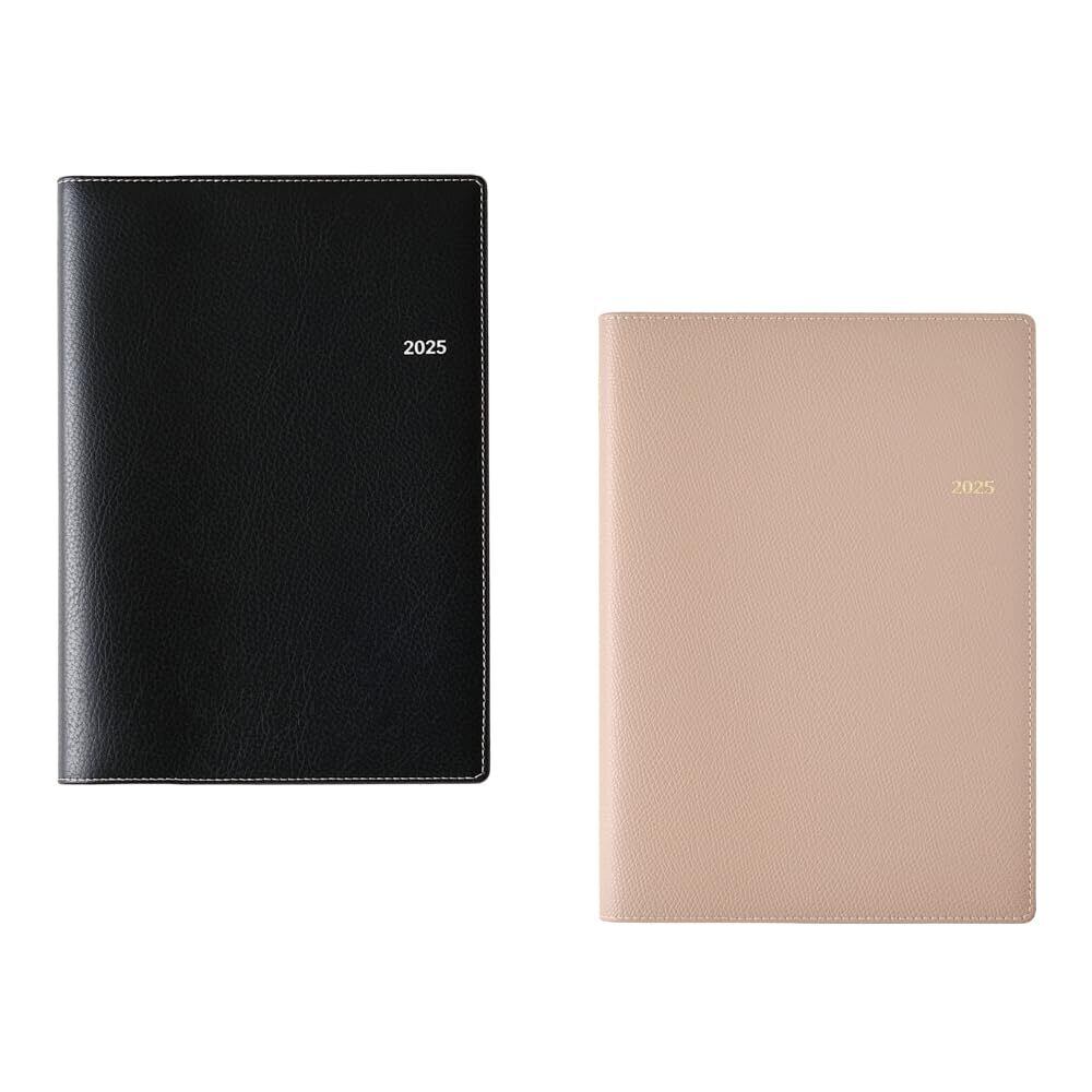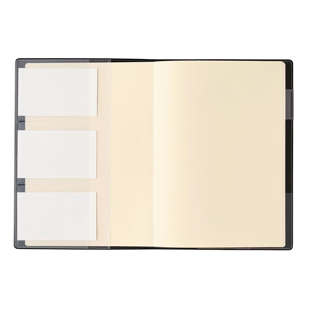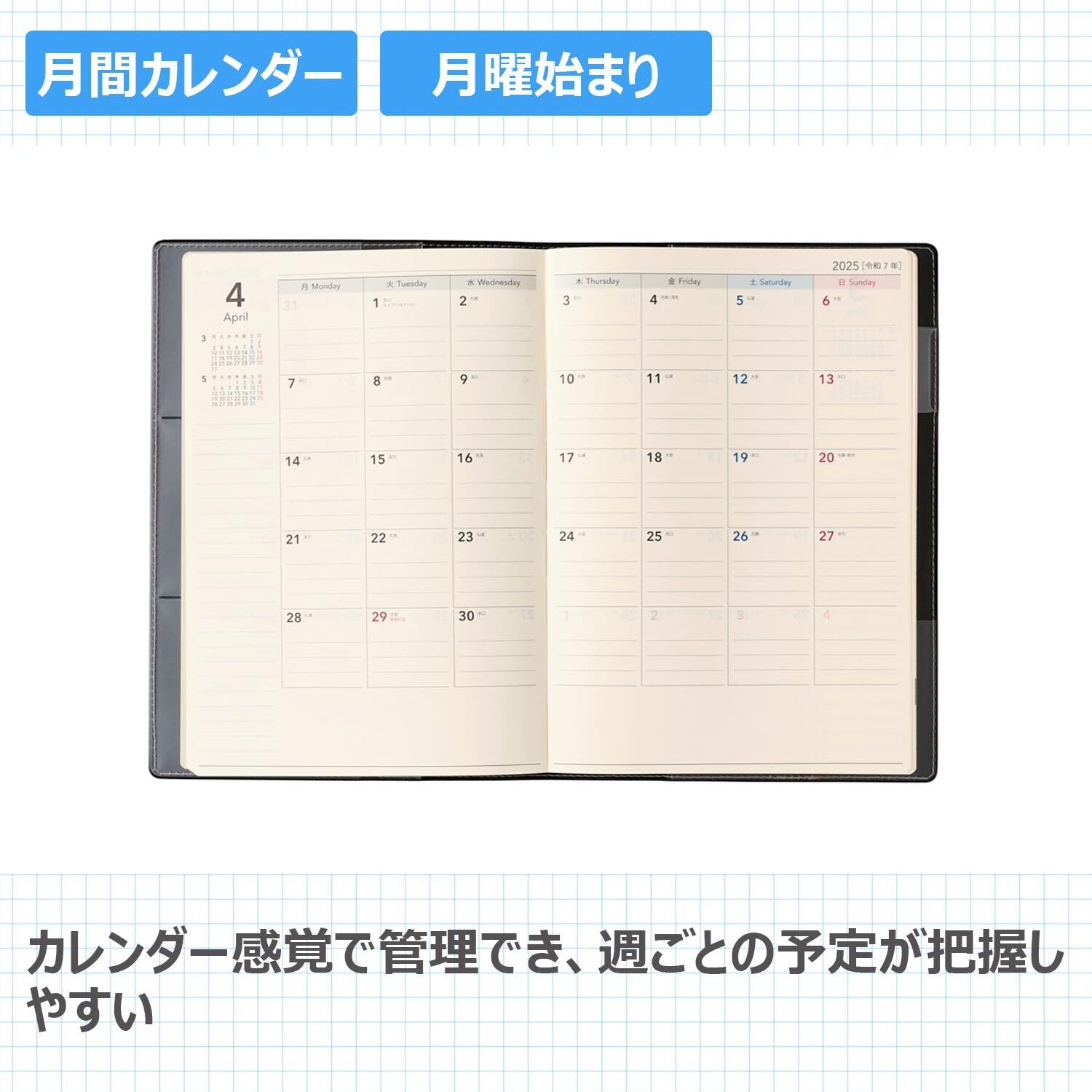 【商品説明】「書く」ことを第一に考えた記入スペース充実のシンプルダイアリーメモページがノート1冊分あり、手帳とノートを一括管理したい人におすすめです。カバー前側には3段名刺ポケット、カバー後ろ側には名刺ポケット・ペンホルダーがついています。【月間ページ】見開き1ヶ月のベーシックなブロックタイプ(月曜始まり)。カレンダーと同じような感覚で見ることができ、週ごとの予定が把握しやすいのが特徴です。【週間ページ】上部のスケジュール欄(月曜始まり)で予定を把握しながら、たっぷりの方眼メモスペースはノートのように使えます。手帳とノートを一元管理したい方や自由にカスタマイズしたい方におすすめです。モデルチェンジ:●扉のデザインを変更しました