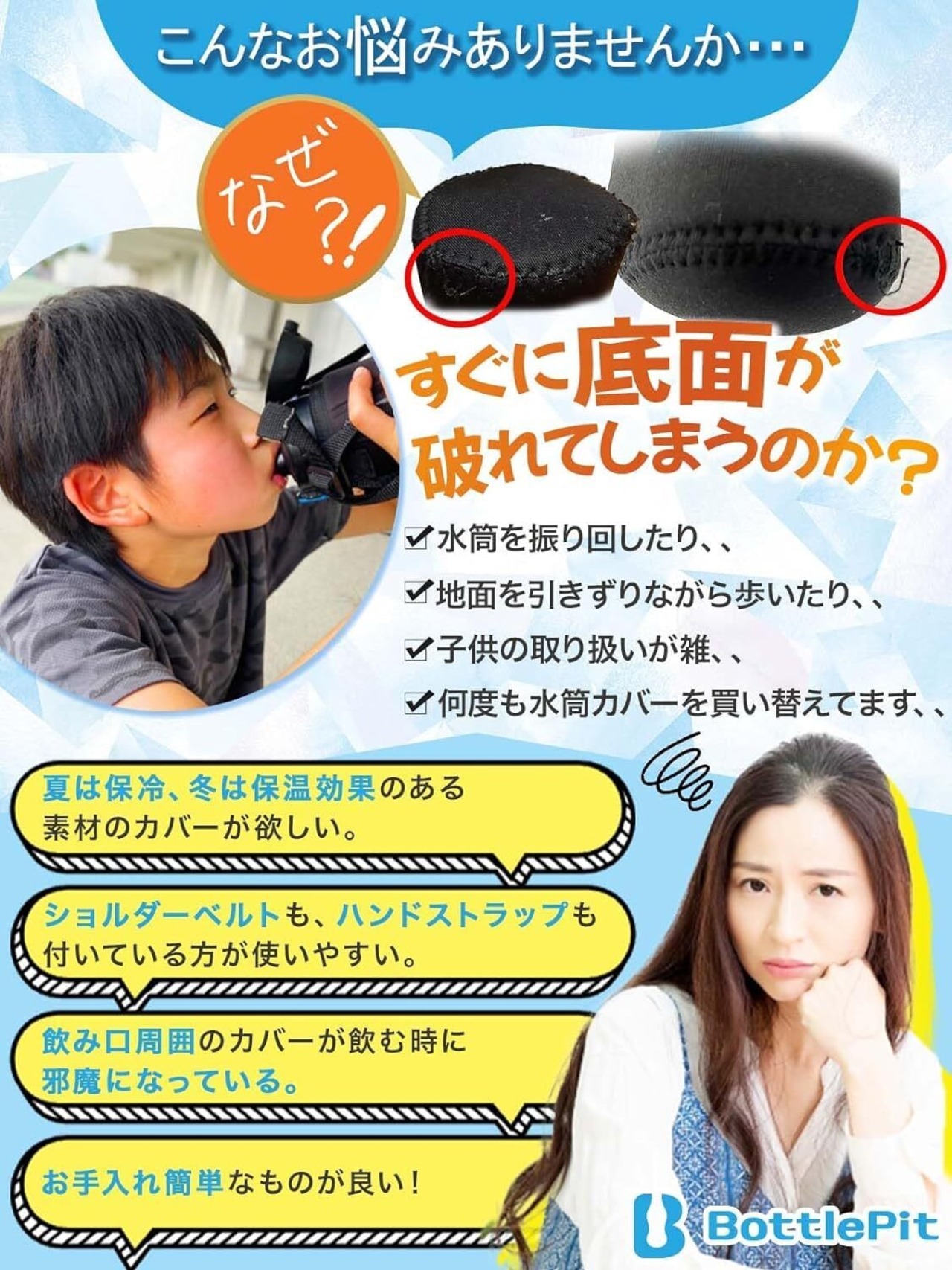 ※水筒は付属しません。【底の耐久性アップ版】使用糸を6倍に増やし、底の縫製強度が34%アップしました。耐久性と耐熱性のあるネオプレン素材でぴったりフィットの水筒カバーでしっかりホールド。水筒をキズから守ります。ネオプレン素材だから保温性も抜群。金属フック採用で耐久性強化。お子さまが少々やんちゃに扱っても壊れにくく設計しました。