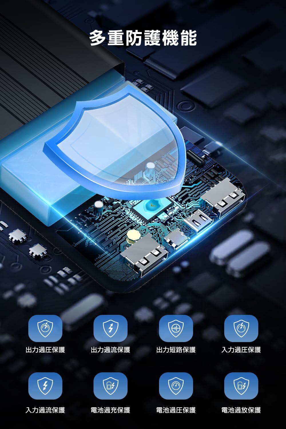【2.4A急速充電対応・2台同時充電可能】出力には二つUSB-A ポートから2台同時に充電可能です。独自のスマート機能によりデバイスを自動で判別し、最適な出力で急速充電を行います。出力は最大2.4A急速充電可能ですから、素早く蓄電可能、より長持ちで旅先やちょっとした外出、出張の際の強い味方に最適。