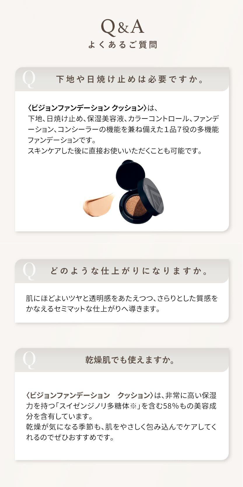 ~なめらかにフィットし、クリアなツヤ肌へメイク中も肌に潤いを与え、しっとり感を保ちます~【ぷるぷるの「クッションジェリー設計」で手軽に密着カバー&ツヤ肌に】 美容成分を配合したまるでゼリーのような弾力のある「エッセンスジェリー(※スイゼンジノリ多糖体を含む美容成分42種(すべて保湿成分))」内に「カバーパウダー(※酸化チタン(基剤)、マイカ(滑沢剤)、シリカ(滑沢剤))」を配合した「クッションジェリー設計」を採用。手軽に使えるのに、みずみずしく透明感のあるツヤ肌に仕上げます。汗や水に強く、くずれにくいウォータープルーフ処方です。