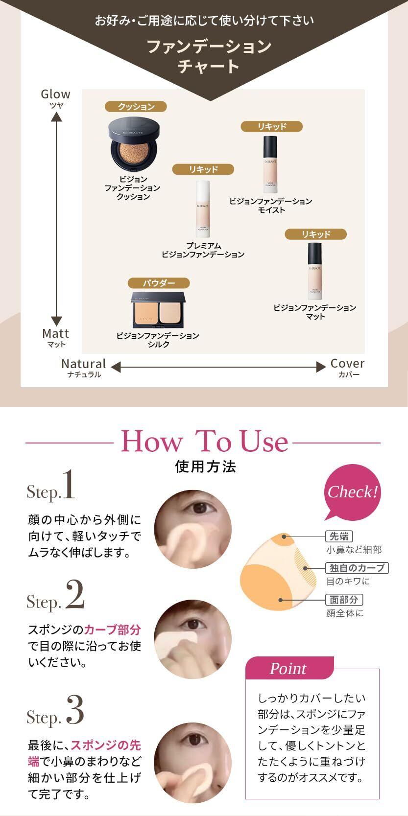 【使いやすさと品質を追求】 日本の職人が手作業で丁寧に仕上げています。この手間をかけた作業によって、ファンデーションが均一に密着し、みずみずしくなめらかな感触を 実現しました。<不使用>パラベン(防腐剤)/石油系界面活性剤/紫外線吸収剤/アルコール/鉱物油/合成着色料/合成香料【使い方】 STEP1.スポンジを密着させて、3回ほど軽く押して適量を取ります。 STEP2.スポンジの広い面で、顔の中心から外側へ軽いタッチで伸ばします。