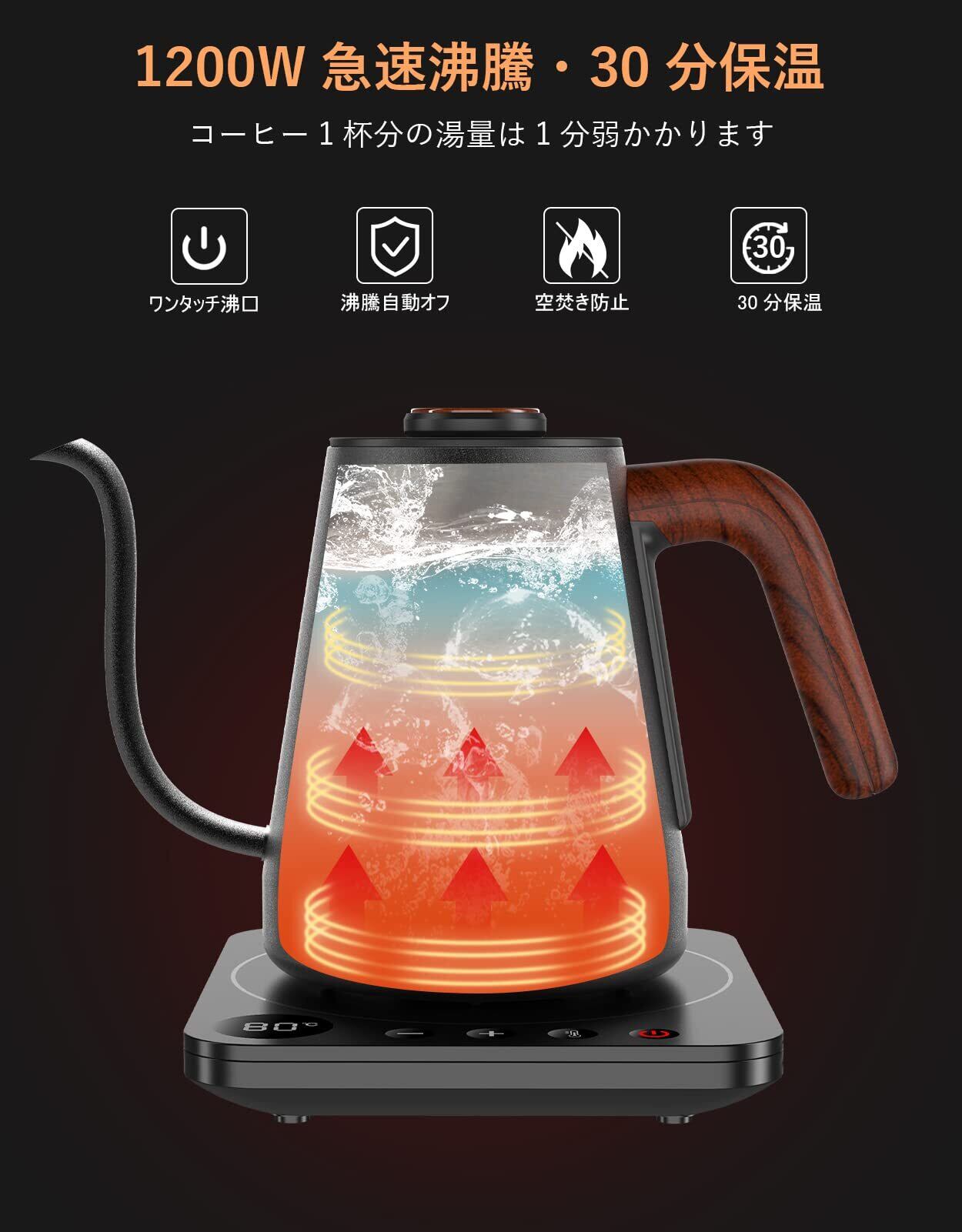 【63秒激早沸騰&安全保護】ケトルパワー:1200w、たった63秒でコーヒー1杯(150ml)の量を沸かします。高品質温度センサー、保温機能、沸騰後自動OFF、空焚き防止、安全安心をご利用頂けます。(注意:ヒーター部分がHAGOOGI以外の他のケトルに合わない)