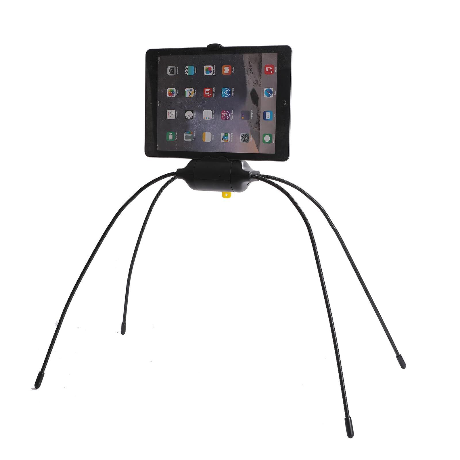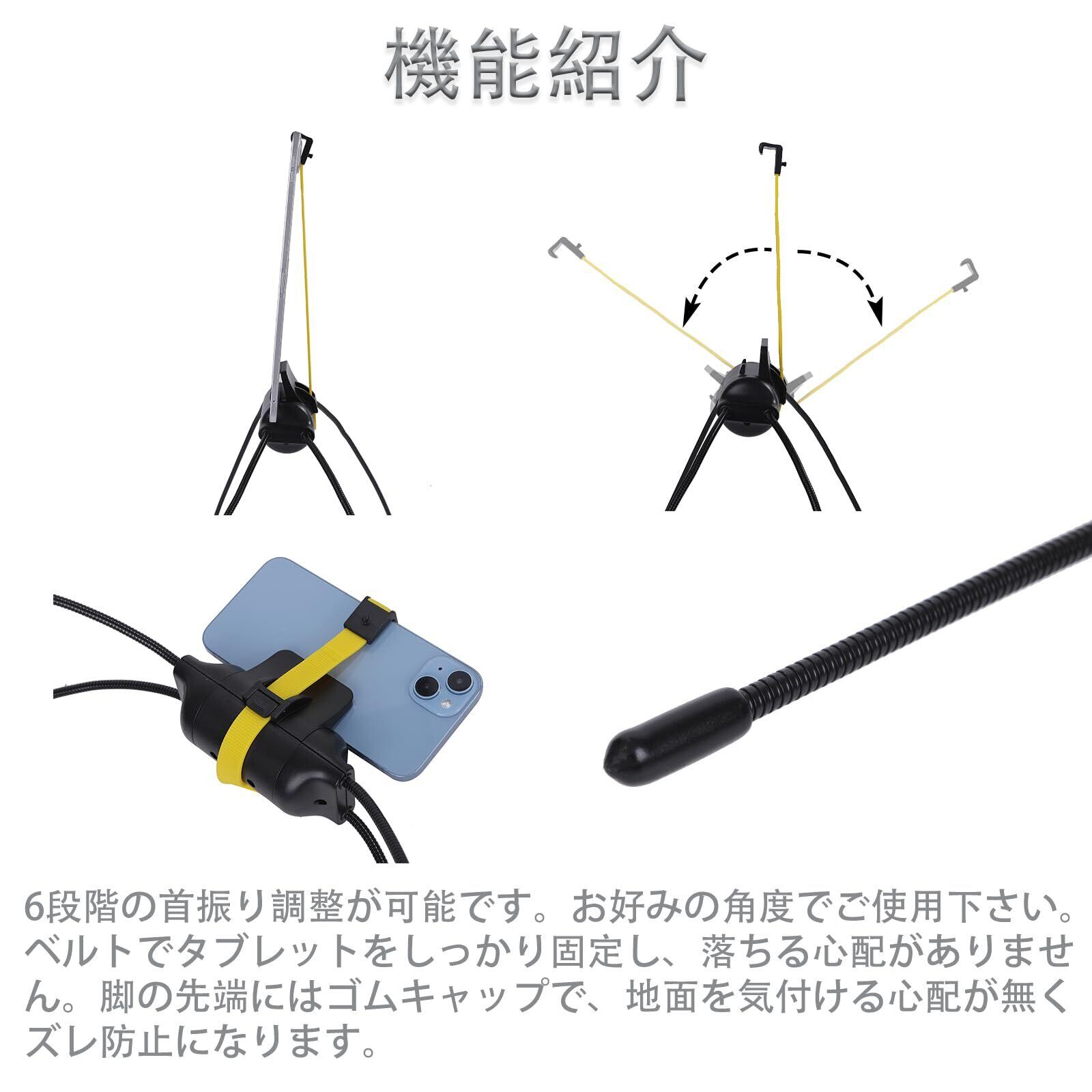 【機能紹介】6段階の首振り調整が可能です。お好みの角度でご使用下さい。ベルトでタブレットをしっかり固定し、落ちる心配がありません。脚の先端にはゴムキャップで、地面を気付ける心配が無くズレ防止になります。