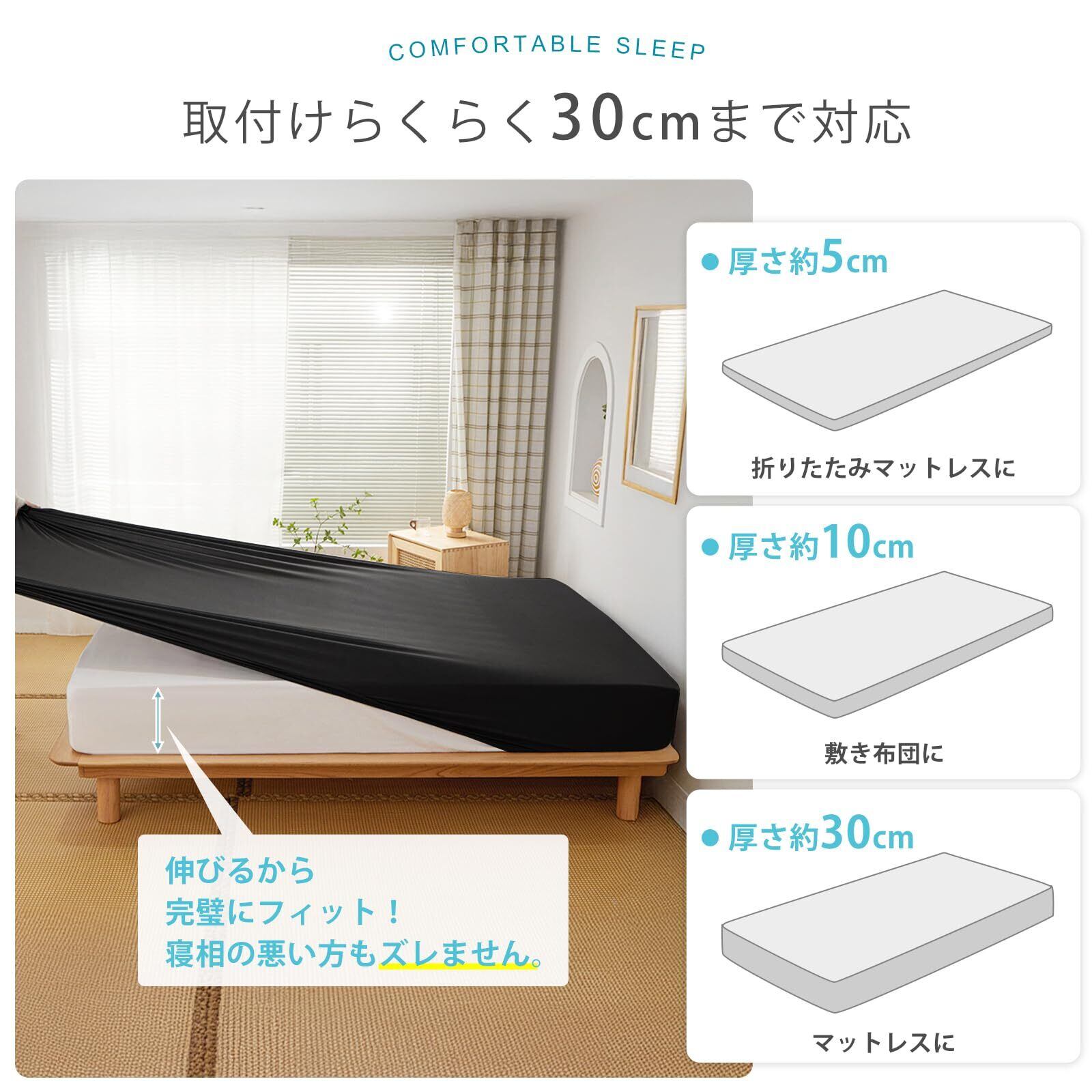 【マチ30cm·ボックスタイプ】だた30秒で着脱可能!Valleinボックスシーツ全周囲ゴムを裁縫されており、普通の20cmよりマチ部分は30CMに伸ばして、30cmほど厚いマットレスでも四角が簡単でぴったり包まれ、ラクラク着脱できます。また、ゴムバンドに360度巻かれているので、どんなに寝相が悪くてもずれることはなく、マットレスもすっきりと保護してくれます。さらに、ベッド、マットレス、布団など多くの寝具に使用できます。