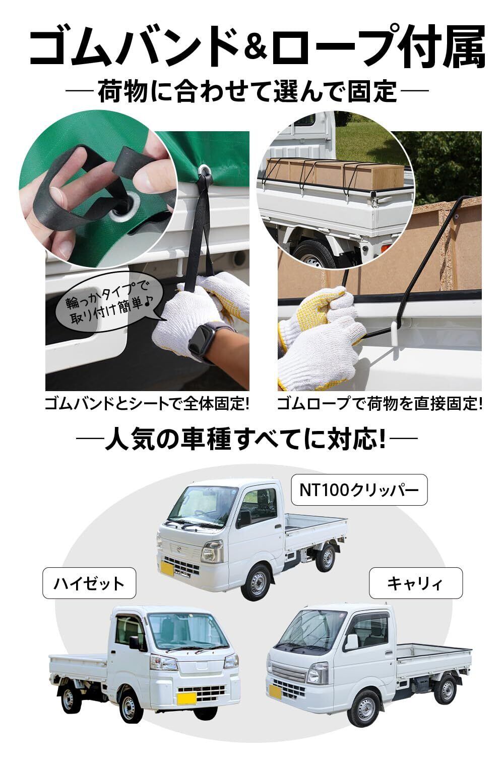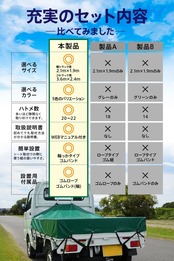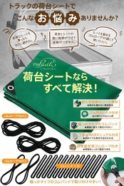 付属品 ①荷台シート本体 ②輪っかタイプのゴムバンド12本 ③荷物固定用のゴムロープ5m ④シート取りつけ用の簡易WEBマニュアル