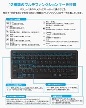 【JIS日本語配列のキーボード&マルチファンクションキーを搭載】 JIS日本語配列レイアウトを採用したキーボードです。長年使っておられる「かな入力」がタブレットやスマートフォンでもお使い頂けます。もちろんローマ字での入力も英語の入力もできます。キータイプは、ノートパソコンのキーボードと同様に軽い力で打鍵できる「パンタグラフ方式」を採用。コンパクトながら19mmのキーピッチと、日本語79キーを採用し、快適にタイピングできるでしょう。さらに便利な、ボリューム調整やメディアプレーヤーの操作などが可能な専用のマルチファンクションキーが12種類搭載しています。離れた場所からボリュームを調整できると、とても快適です!