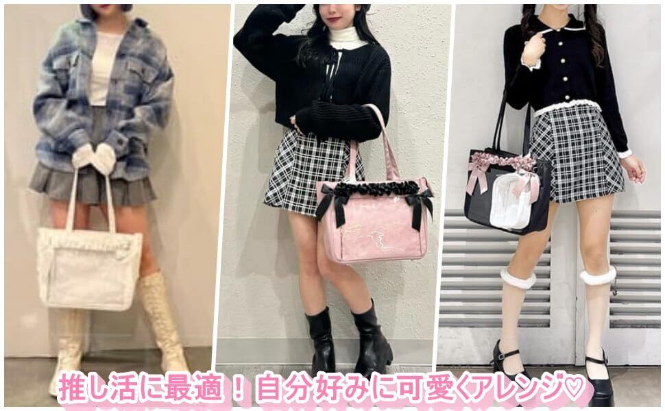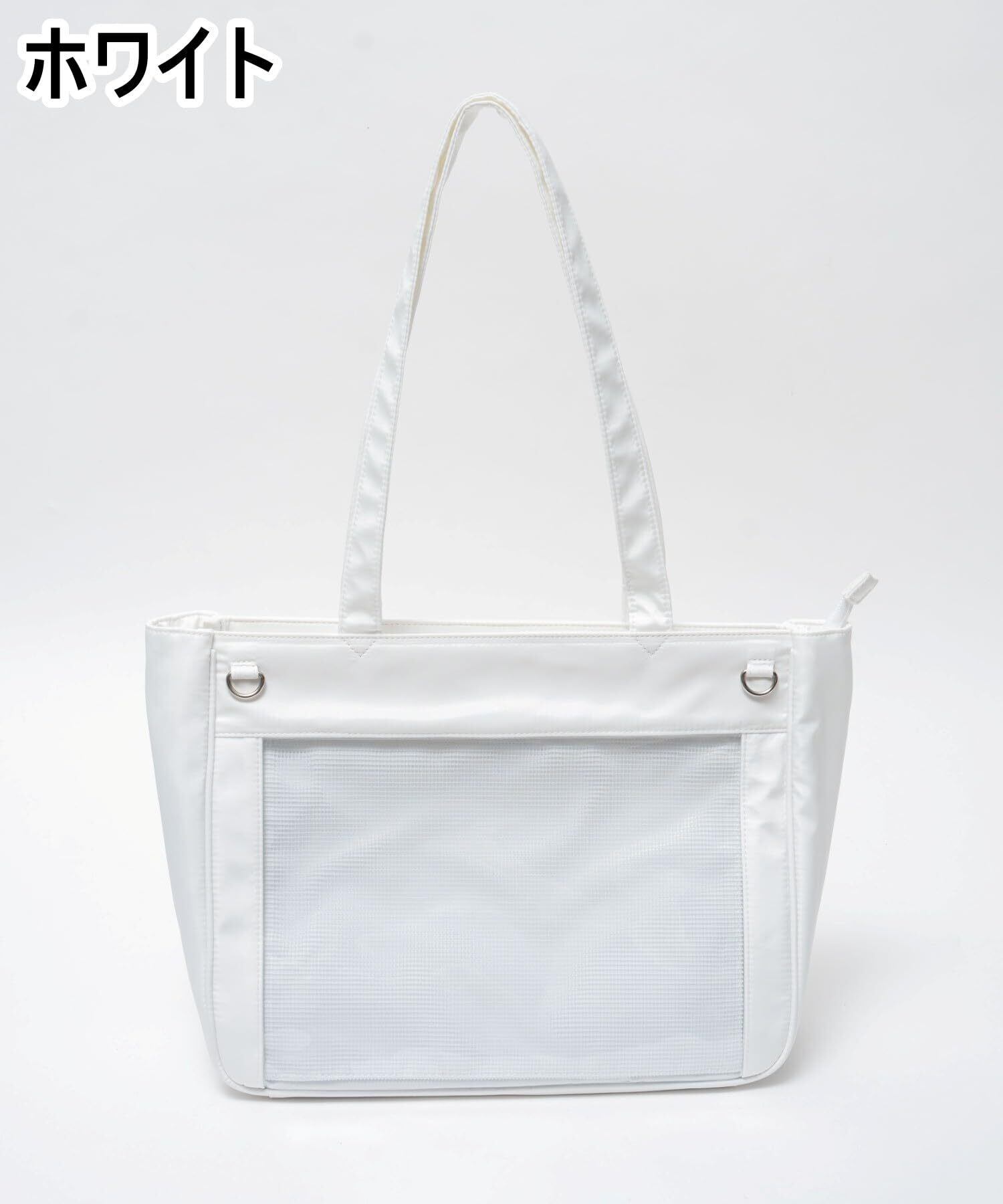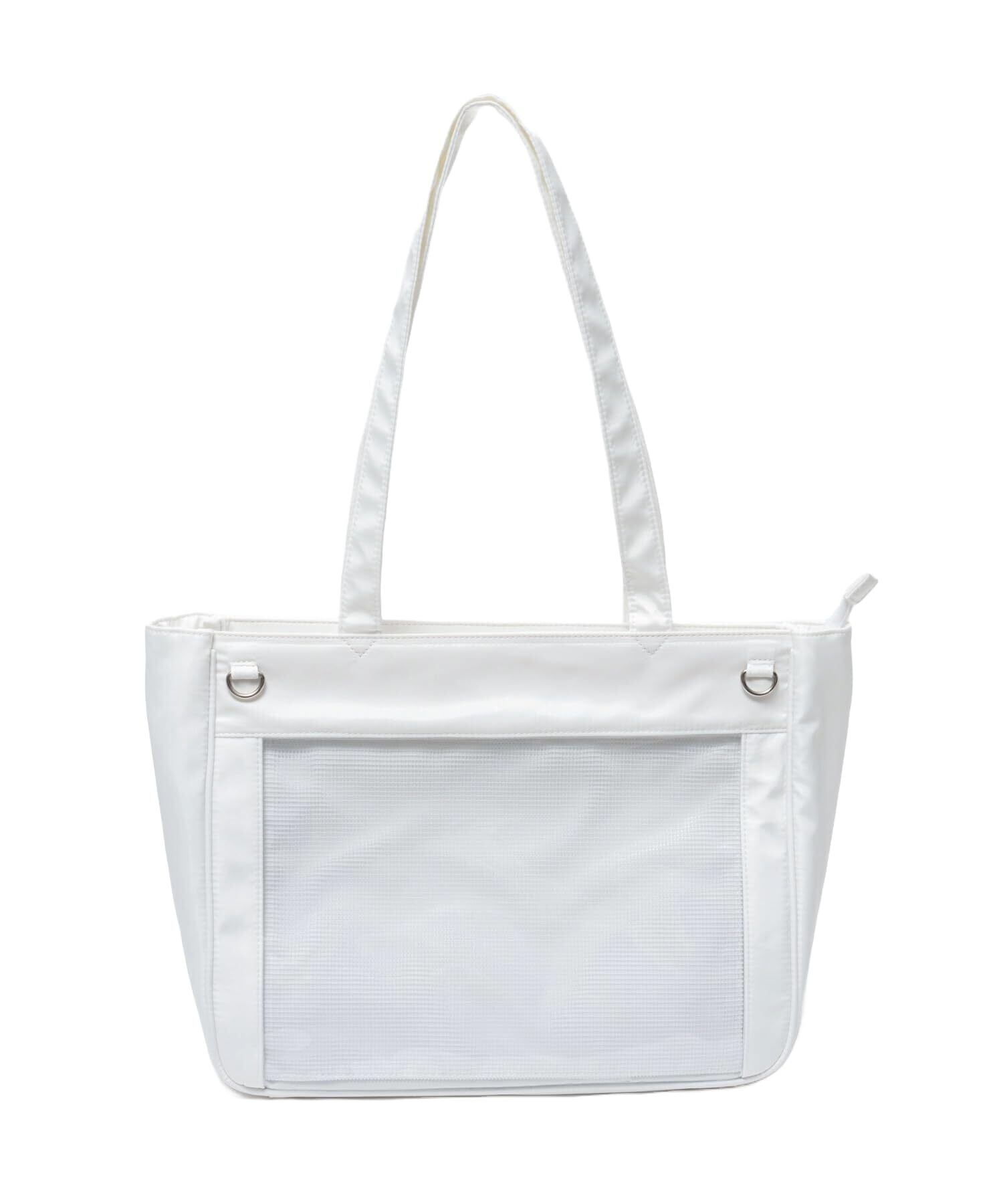 ・ポリエステル素材で汚れにくく軽量です。 ・両サイドのDカンで自由にアレンジ! 別売りの【WG23AW11-G0002 ときめきDIYセットS】と 合わせて、リボン&フリルのデザインバリエーションが楽しめます。 ・缶バッチを付ける、メッシュ×本体生地のリバーシブルシート付きです。 隠したい時はさっと裏返しに! バッグ内側からシートはバッグ内側から出し入れするのでクリア面がキレイに見えます。 ・便利な内側ポケット メッシュポケット、ペンライトバンドが付いています。 グッズの持ち運びにやさしいフワフワポケットも! ・底面汚れを軽減する底鋲付きです。