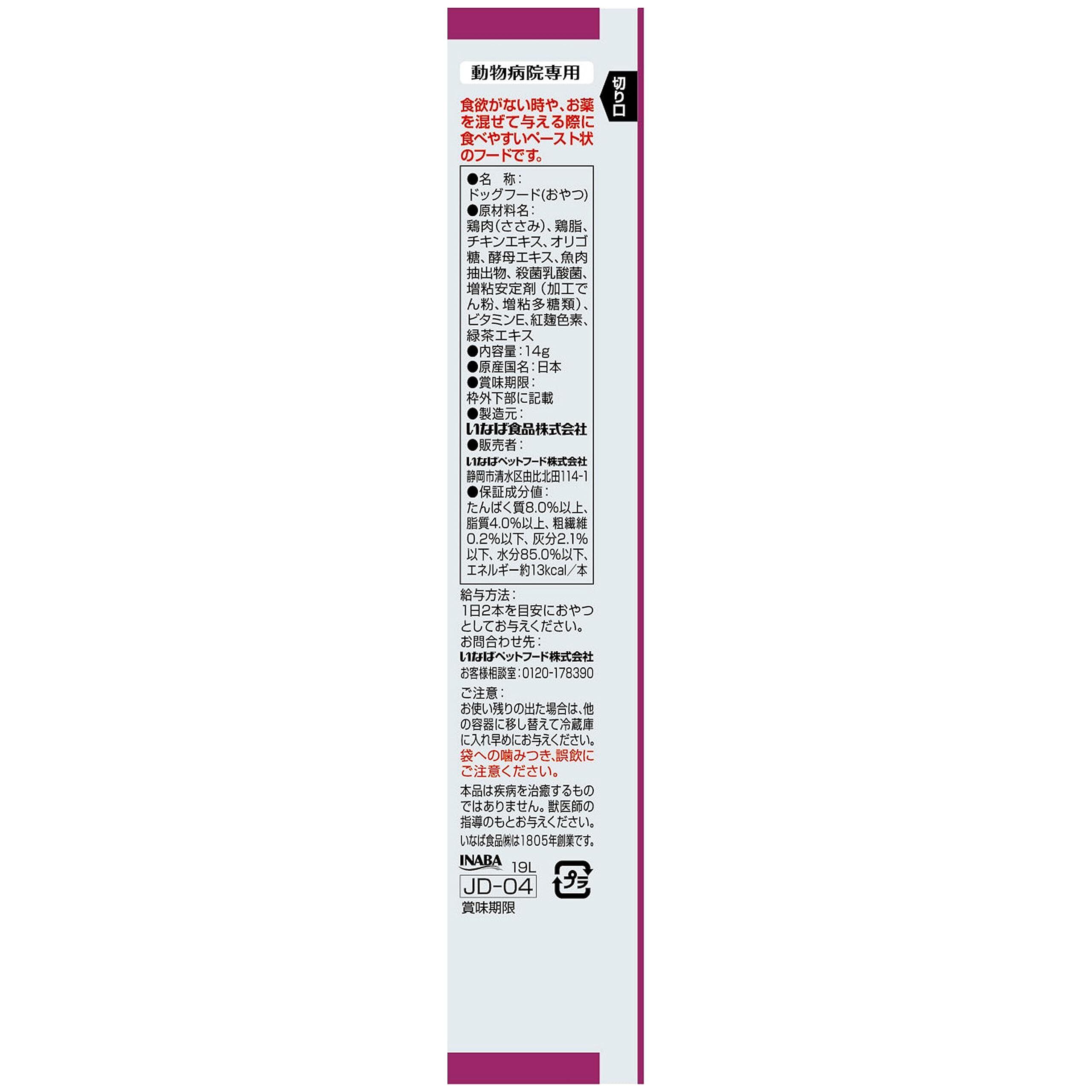鶏肉(ささみ)、鶏脂、チキンエキス、オリゴ糖、酵母エキス、魚肉抽出物、殺菌乳酸菌、増粘安定剤(加工でん粉、増粘多糖類)、ビタミンE、紅麹色素、緑茶エキス