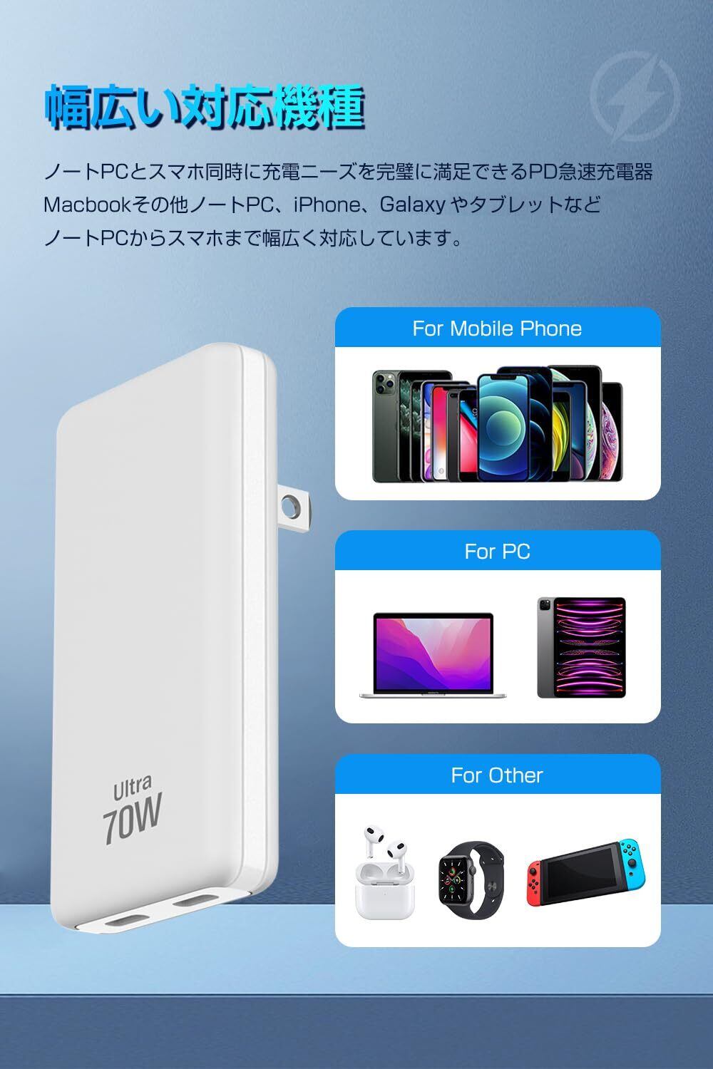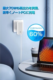 【単ポート最大70W出力】一般的な65W充電器から進化した70W高出力、MacBook Airにぴったりです。USB-C単ポート利用する場合が、MacBook Airに、わずか30分で最大50%まで充電できます。20V/3.5Aの圧倒的な急速充電スピートで、いつでもどこでも、あなたのノートPCがフルパワーで動作できます。