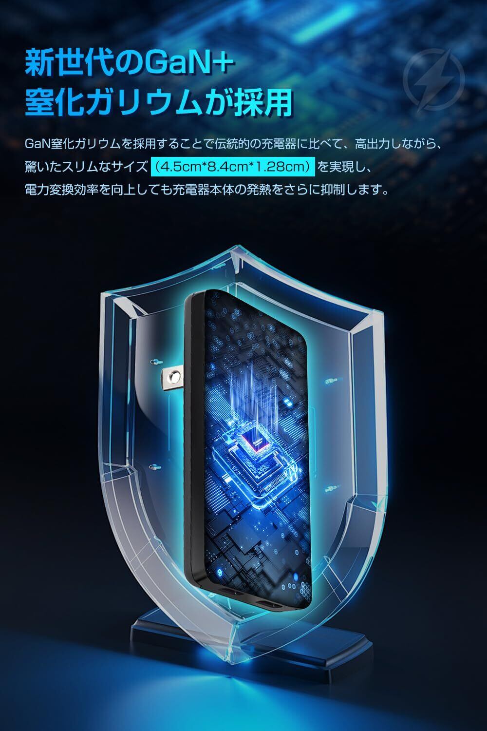 【新世代のGaN+窒化ガリウム】新世代の窒化ガリウム(GaN)を採用することで、高出力かつ小型化を実現し、放熱性が向上し、より優れた性能を達成できました。多重の保護システムを合わせて安全性が高まります。デバイスと接続して、機器を自動で判別して最適な電力で充電します。過充電を抑制し、過電圧、過電流、過熱、および回路のショートを防げ、パワフルかつ安全に充電が行います。