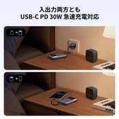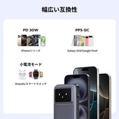 【 iPhoneシリーズにも急速充電・PD 30W高出力対応 】PD 30W高出力により、iPhoneシリーズに急速充電対応します。PD対応しながら、PPS、QC4+、QC3.0、UFCS(33W)、AFC、FCP、SCPなど、あらゆる急速充電プロトコルにも対応し、ios端末やAndroid端末など持っているデバイスが幅広く充電します。一体型ケーブルは出力だけでなく、入力もPD 30Wに対応し、30W出力のUSB-C急速充電器と併用すれば約2時間でバッテリー本体に急速充電が可能です。