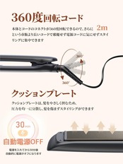 【回転式の電源コード・自動電源OFF付き2way ヘアアイロン】スタイリングの邪魔をしない長さ約2mのコード。接続部分が360度回転するため、ねじれにくく絡まりにくい構造です。起動から約30分経過すると自動で電源がオフに。つけっぱなしによる火事や事故を防止します。