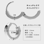 【男女どちらでも着けられるサイズ】小ぶりでさりげない存在感。シンプルなデザインと絶妙なサイズ感で、メンズレディース問わず着用いただけます。ペアアクセサリーとしてもおすすめです。「直径」13㎜「幅」3㎜「厚み」2㎜「ポスト直径」0.8㎜(20G相当)「重量」 1.3g