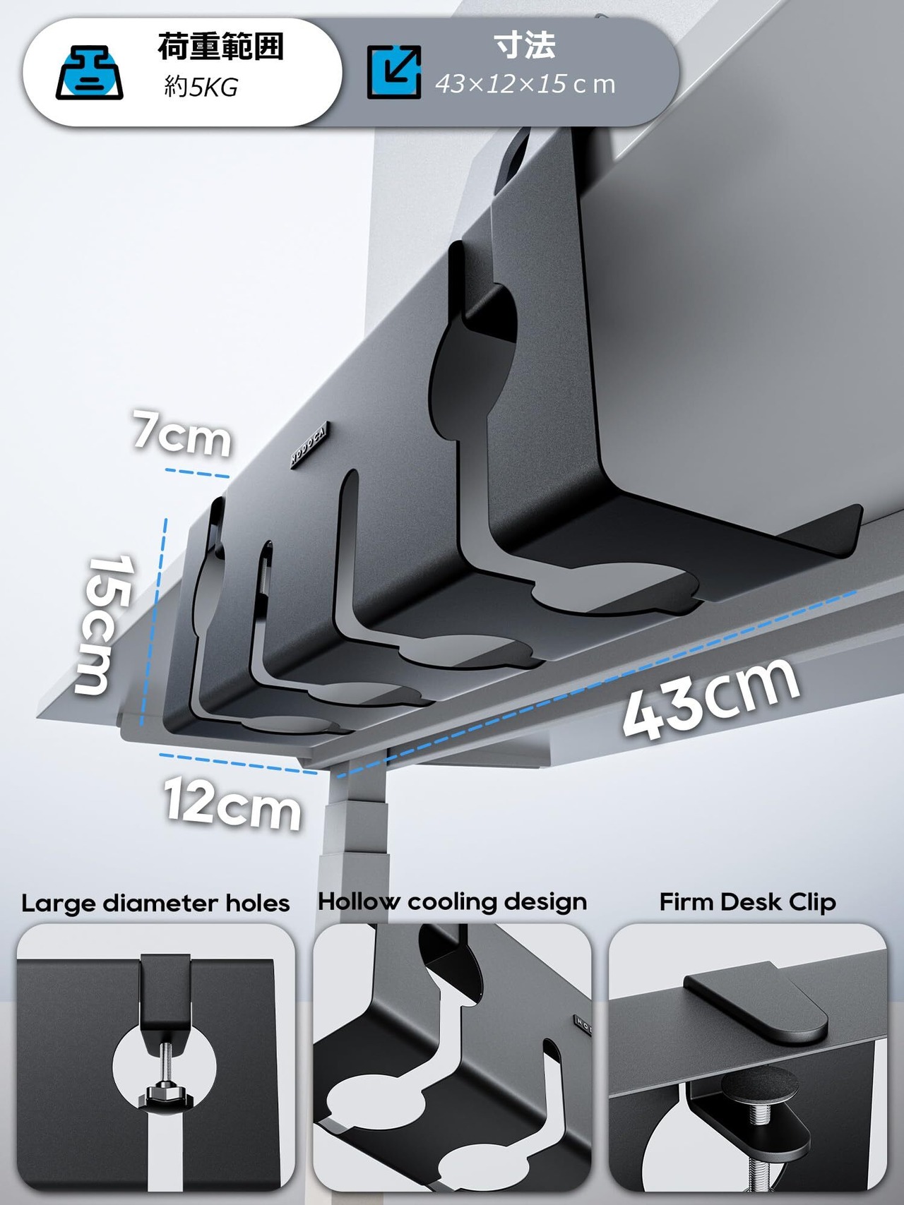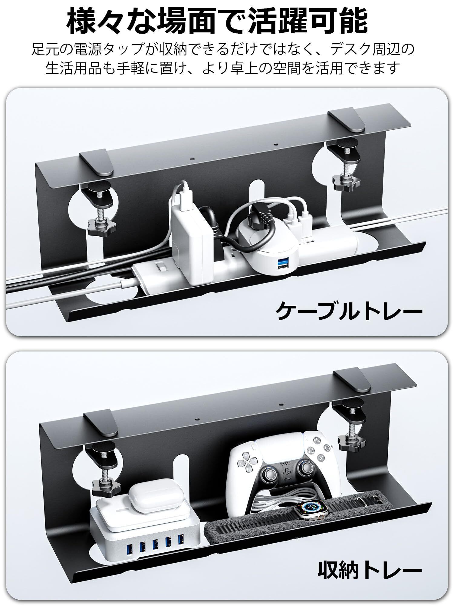 特徴:裏側にも(外向き)挟んで取り付けが可能です。ケーブルラック素材:スチール、優れた耐久性 滑り止め付き。最大積載質量:5kg、天板必要奥行:5cm以上、クランプ固定式(取り付け部に丸みや段差、凹凸のある天板にはご使用いただけません)。