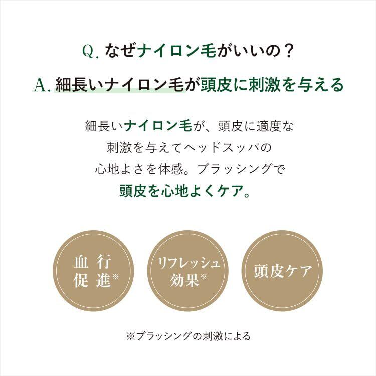 ●細長いナイロン毛は、デリケートな頭皮を傷めることなく、ブラッシングによる頭皮マッサージ効果を発揮し、ツヤのある健やかな髪を育てる頭皮環境へと導きます。