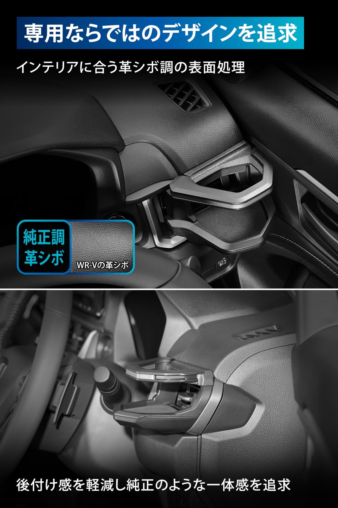 まるで純正品のような一体感のあるデザイン WR-V専用デザインなので、インパネからドリンクホルダーへ自然に繋がるように革シボ加工を施し、アームのフロント部分には水平基調のインテリアに合うダークシルバーのラインをアクセントに入れることでWR-Vの内装にマッチする仕上がりにしています。(特別仕様車などを除く)