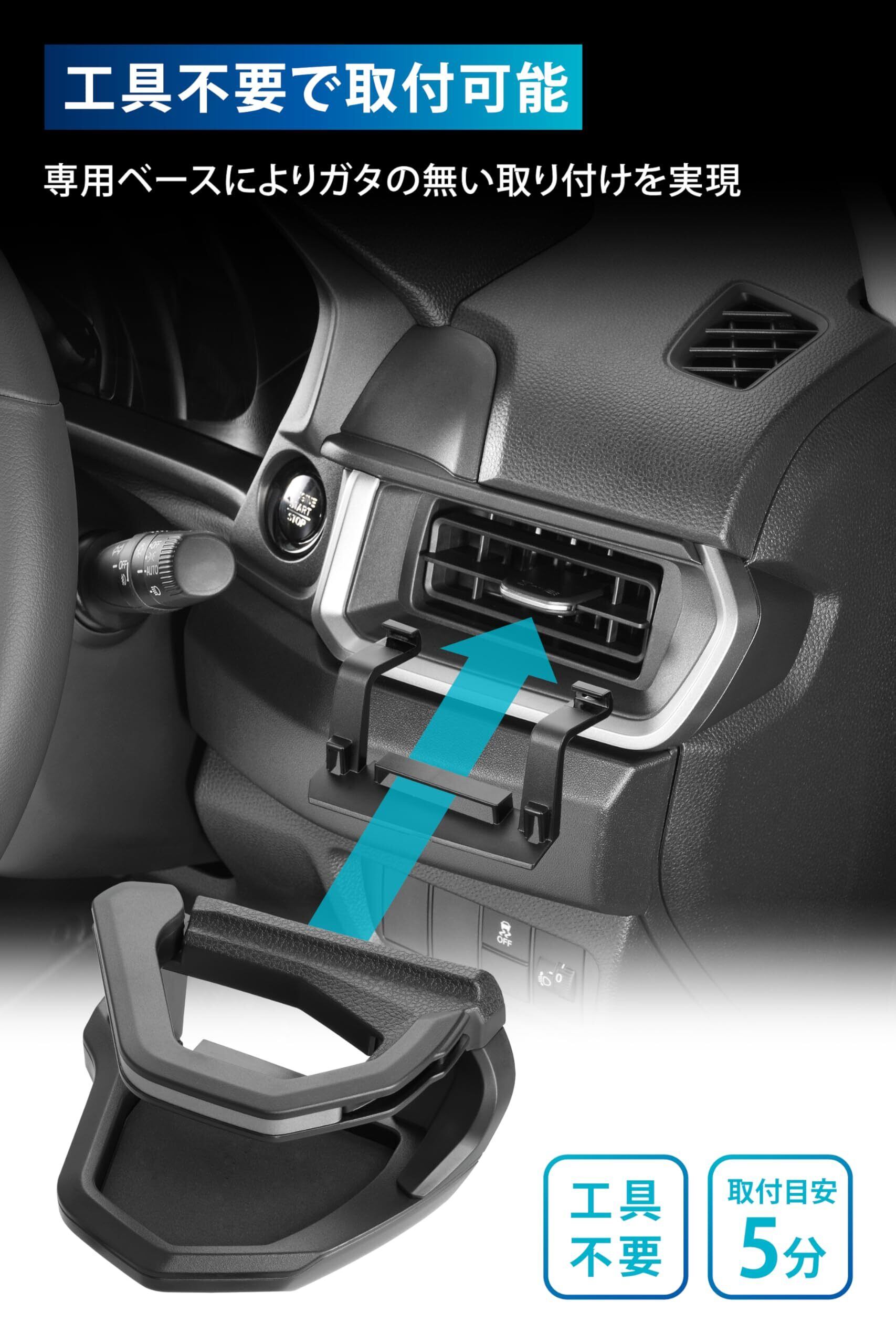 エアコン吹き出し口に取り付ける一般的なエアコン取り付けのドリンクホルダーは、ステアリングの位置によっては本体がウィンカーレバーと近くなり運転しづらくなることがあります。専用設計のためウィンカーレバーとの干渉を避けるベストなポジションにドリンクホルダーを設置でき、ステアリングがどの位置になっても運転の妨げになりません。(ハンドルの位置によってはドリンクホルダーと約25mmまで近接します)