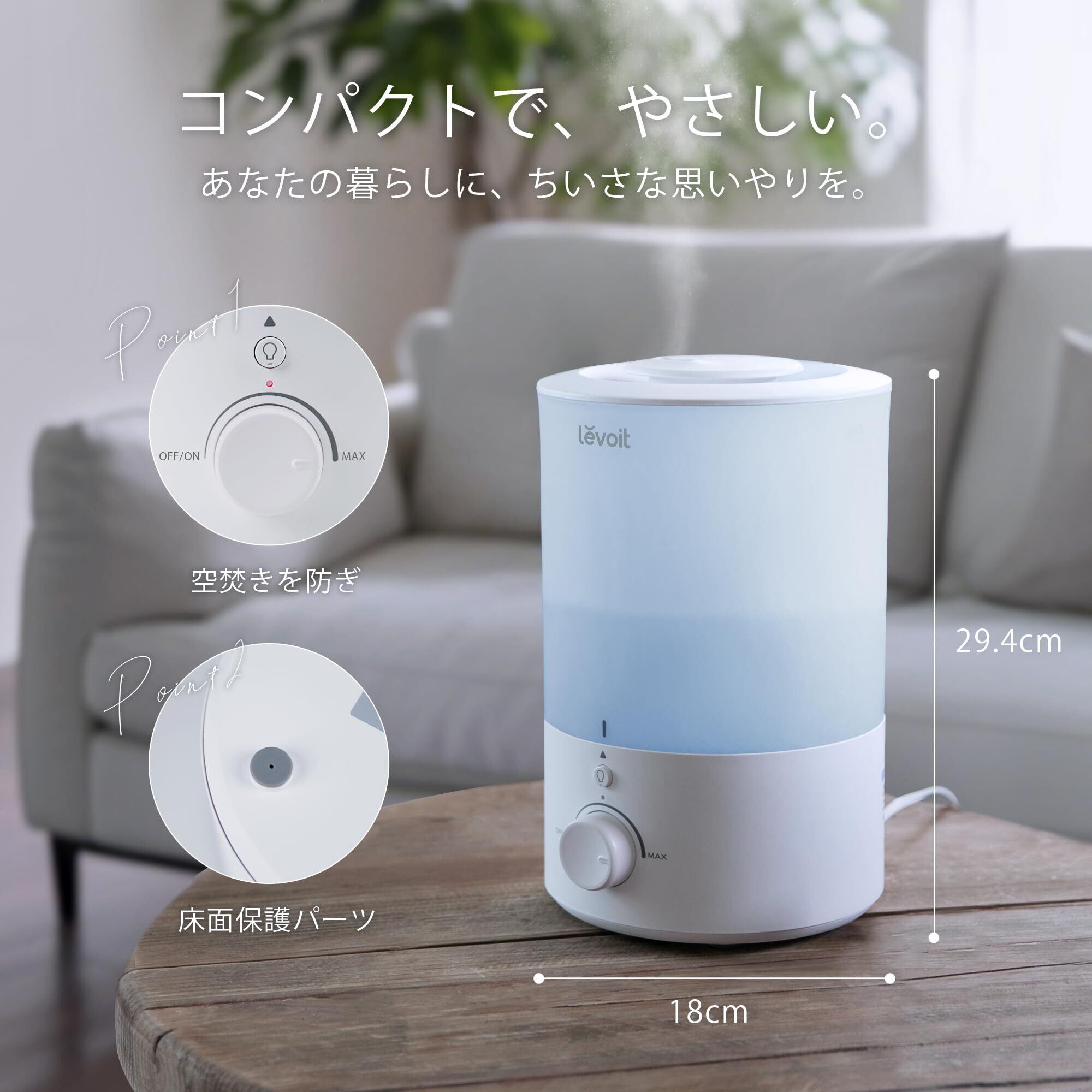 【世界中に大人気なLevoit・安心の2年間保証】①Levoitは、世界中3000万の家庭の乾燥問題を解決した加湿器人気ブランドで、皆様のおかげさまで、Levoitは2021年アメリカで加湿器人気ランキング1位になりました。今年もどうぞよろしくお願い申し上げます。 ②BPAフリーの高強度素材を採用しており、無毒・無臭、赤ちゃんがいる家庭でもご安心いただけます。 ③Levoit加湿器は日本のPSEと欧州のEN規格に適合しており安心してご使用いただけます。 購入から30日であれば無条件で新品との交換を承ります。また、2年の保証期間、24時間日本語対応と無期限のサポートが付帯しています。 ④面倒な手続きが一切なく、注文番号があれば対応します!不具合や、ご使用についてご不明な点がございましたら、お気軽に弊社までご連絡ください。