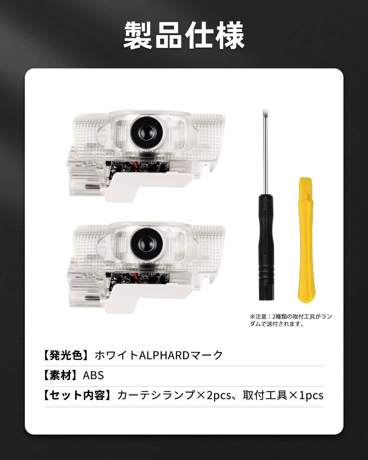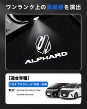 1.【適合車種】①トヨタ アルファード ALPHARD 30系; 型式:AYH/GGH/AGH30・35W 年式:H27.1~; ②トヨタ アルファード ALPHARD 40系; 型式:AGH4#W/AAHH4#W;年式:2023年6月~現行;セット内容:カーテシランプ×2pcs、取付工具×1pcs。