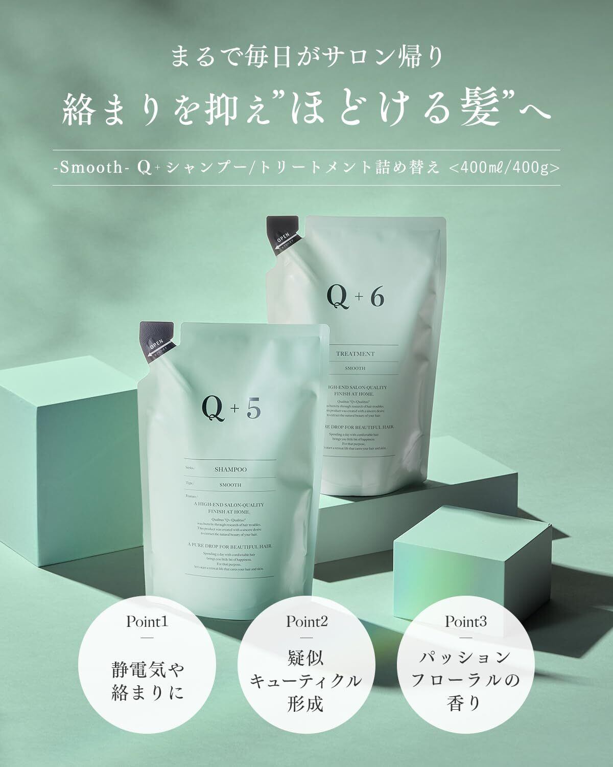 ✨【 サロン品質のヘアケアを、もっと身近に。 】「Quality + = Q+( クオリタス )」日常使いできるサロンクオリティを。その想いでQ+は立ち上がりました。スムースシャンプー/トリートメント セット ー絡まりを抑え "ほどける髪" へー(詰め替え用)