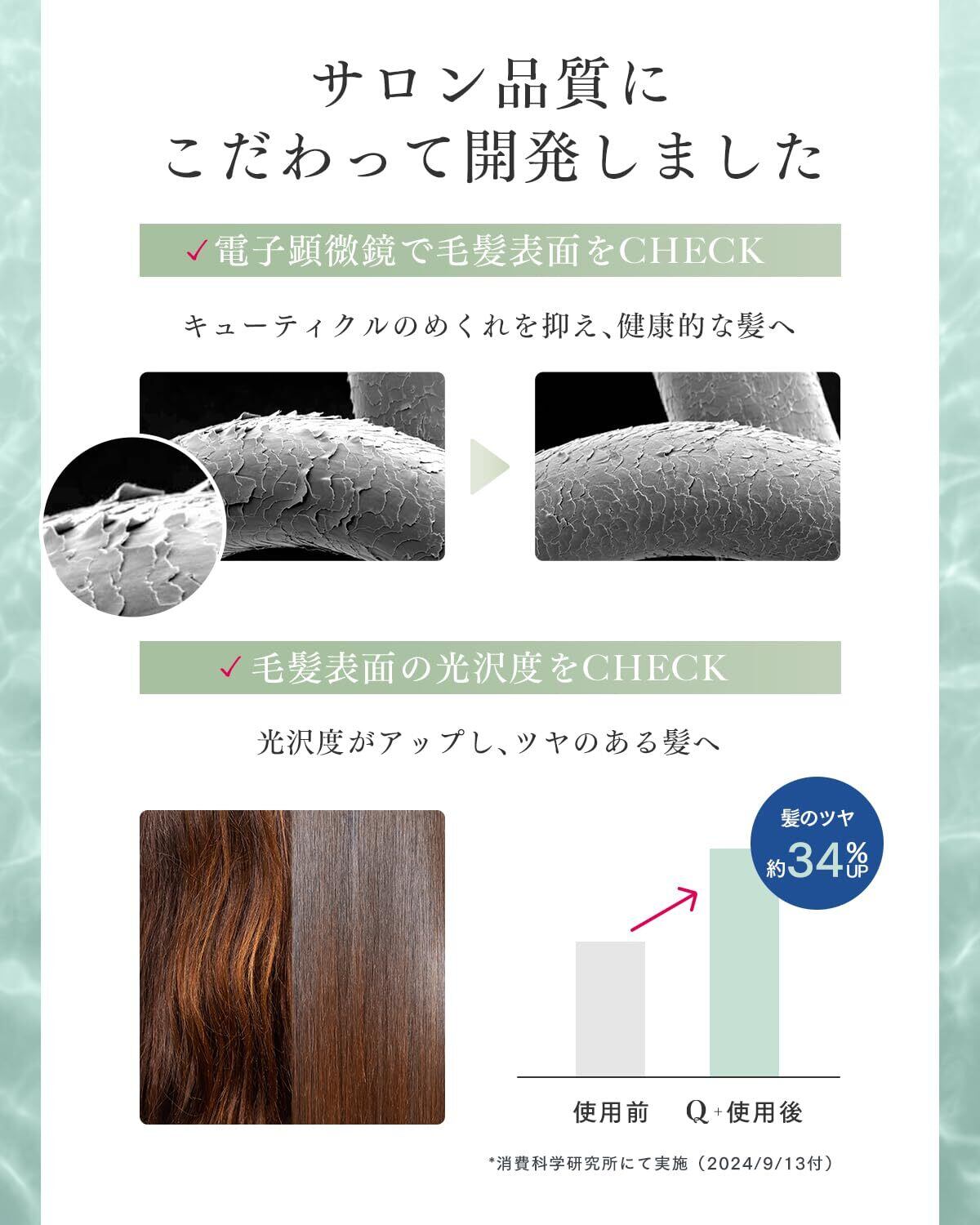 ✨【 毛髪試験*を実施 】電子顕微鏡で毛髪表面をCHECK 毛髪表面の光沢度をCHECK 本当に「高品質なのか」を確認するべく、毛髪試験*で調べました。*消費科学研究所にて実施(2024/9/13付)