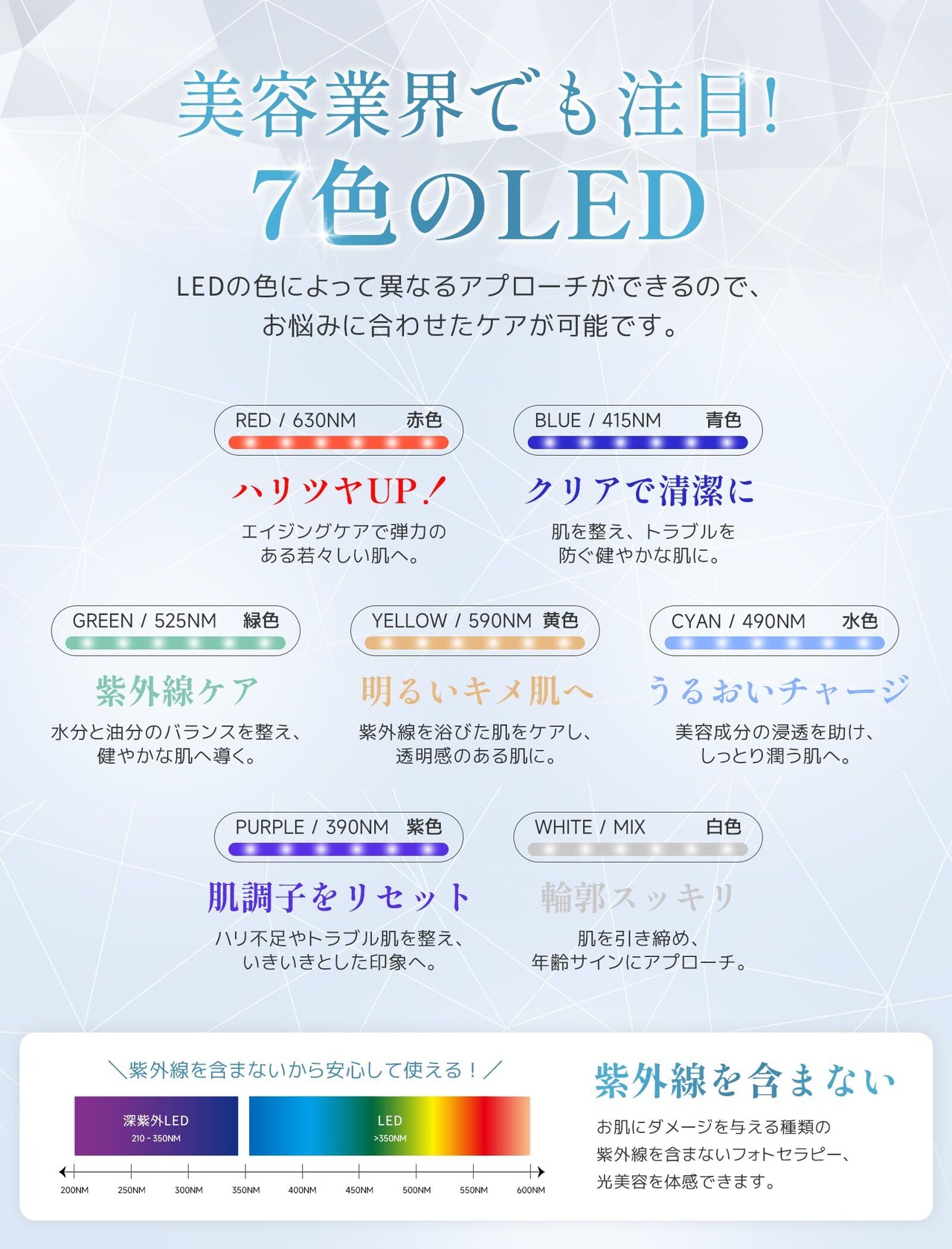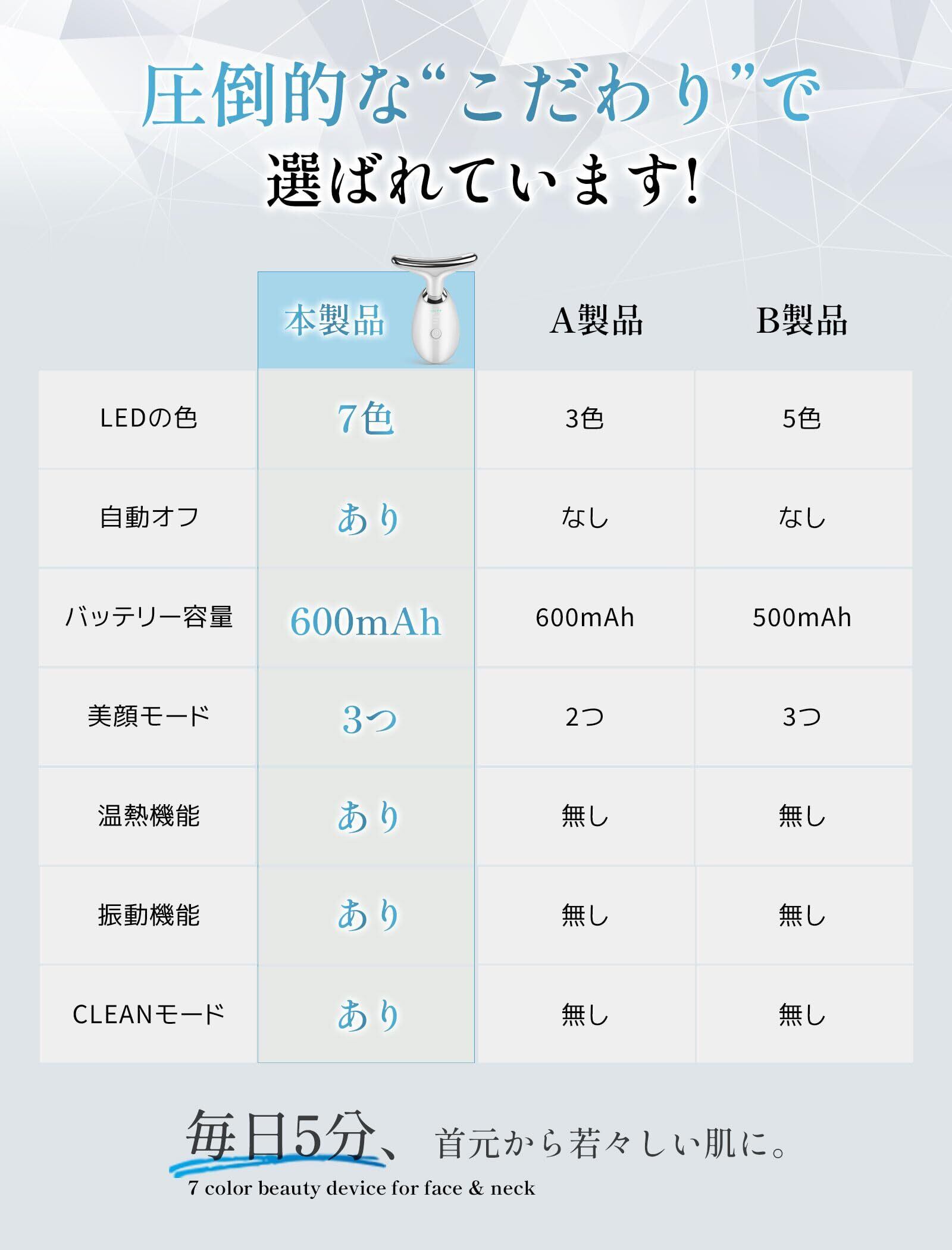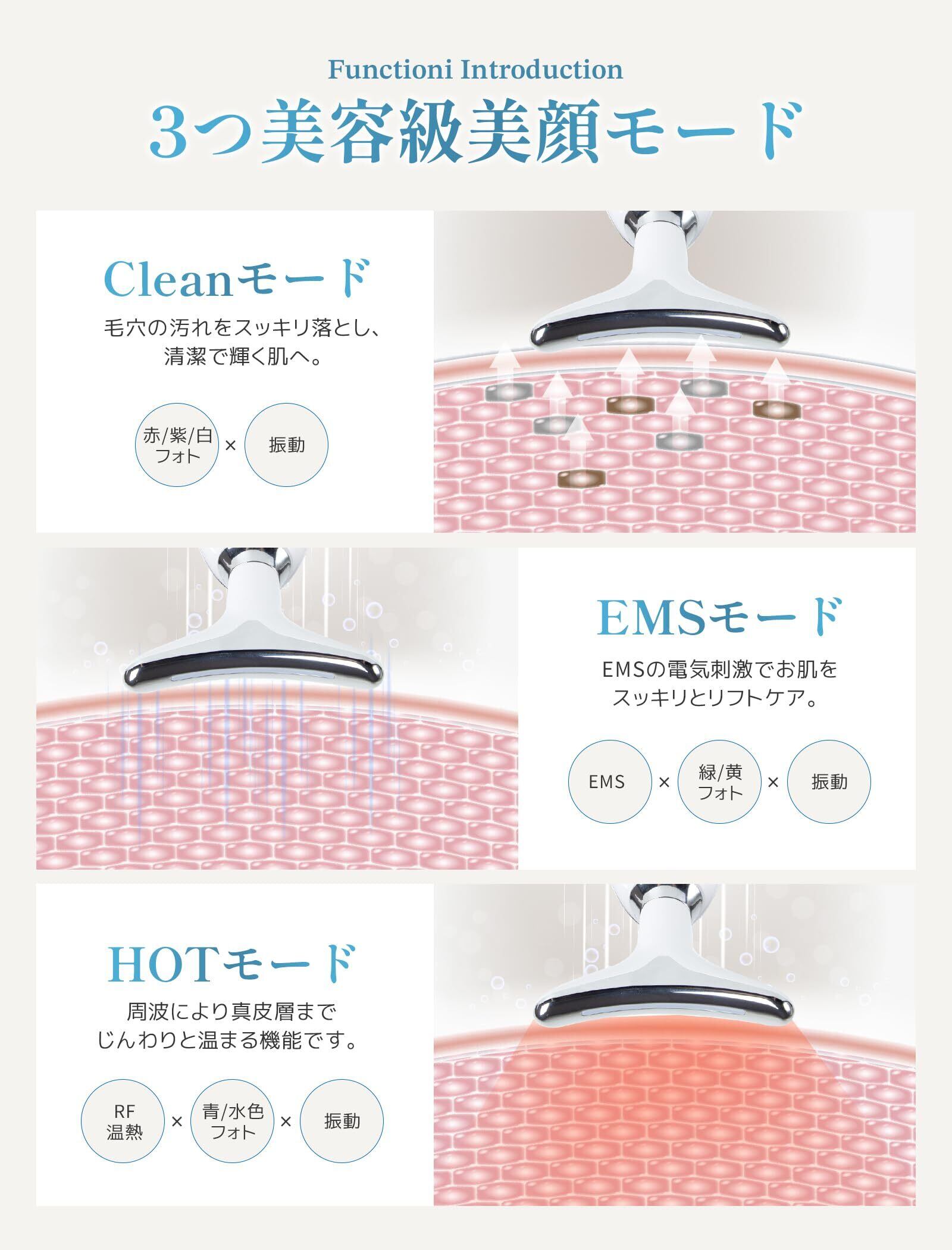 【人気の機能を組み合わせたマルチな美顔器が登場!】:こちらの美顔器は「CLEANモード」、「EMSモード」、「HOTモード」三つのモードを搭載し、様々な肌のお悩みに応えます。また、7色光エステ機能が搭載され、サロン級の美肌ケアを自宅で手軽に。