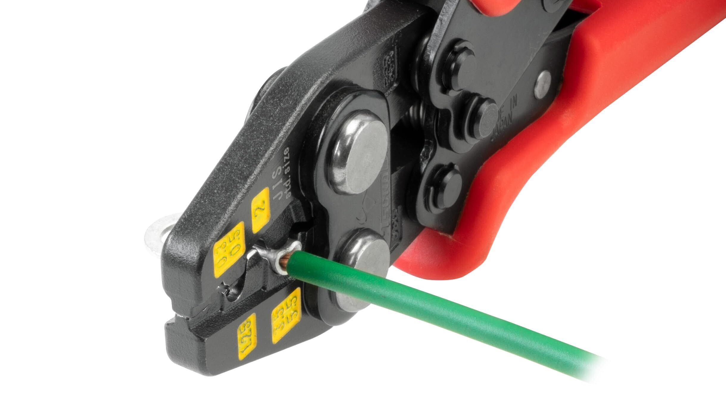 軽量・コンパクトタイプ、片手で5.5sq電線の圧着ができます。トグル機構採用で単位ストロークあたりの所要握力を軽減します。IEC・DIN表示、JIS表示どちらもあります。
