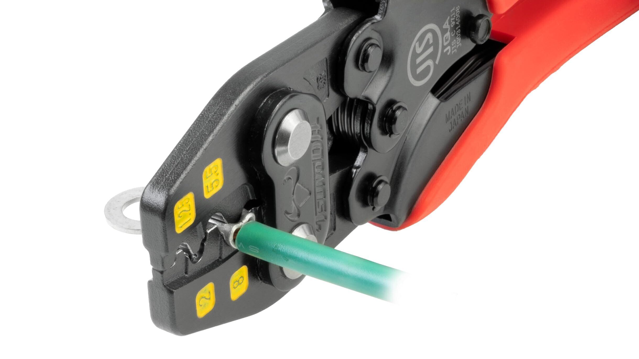 JIS C 9711認証取得商品。安心安全確実スピーディーな圧着。裸圧着端子8まで圧着が可能。グリップは力が入れやすいよう太く・エラストマーグリップを採用し手の負担を軽減。電線挿入作業時に端子がつぶれずに仮押さえができるので作業がスムーズに進みます。安心の日本製。出荷時の全数検査を行いパッケージに検査証封入。