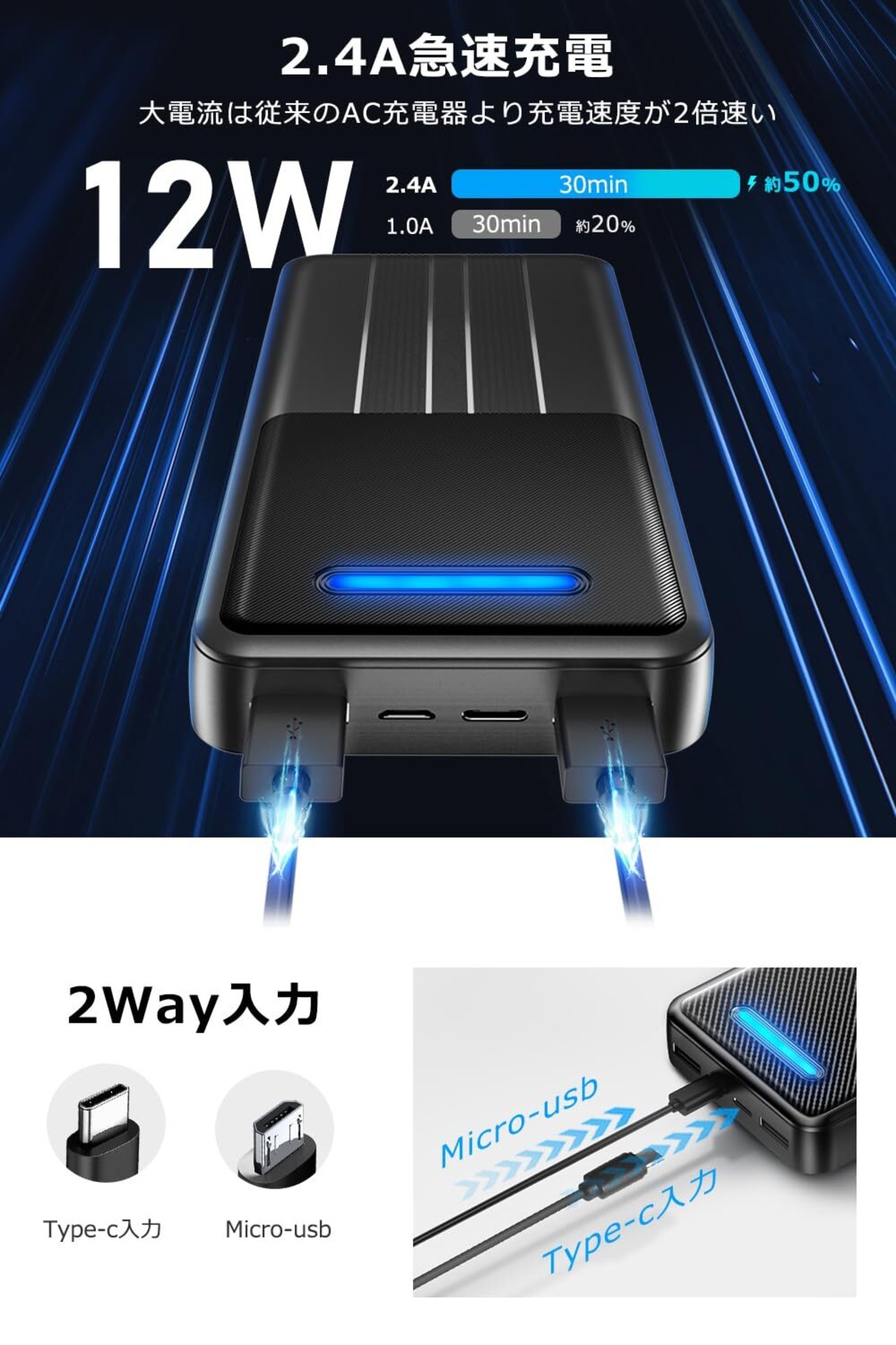 【最大10.5W高速蓄電&Smart IC充電】入力は最大2.1A急速充電可能、入力に対応したUSB Type-C×1ポートとUSB Micro-Bを搭載しており、お使いの充電ケーブルに合わせて接続するポートをお選びいただけます。旅行、出張など電源の取りにくい環境でバッテリー切れの心配がありません。効率的な充電を行う「低電流モード」を備え、Bluetoothイヤホンやスマートウォッチなど小型の機器も充電可能です。
