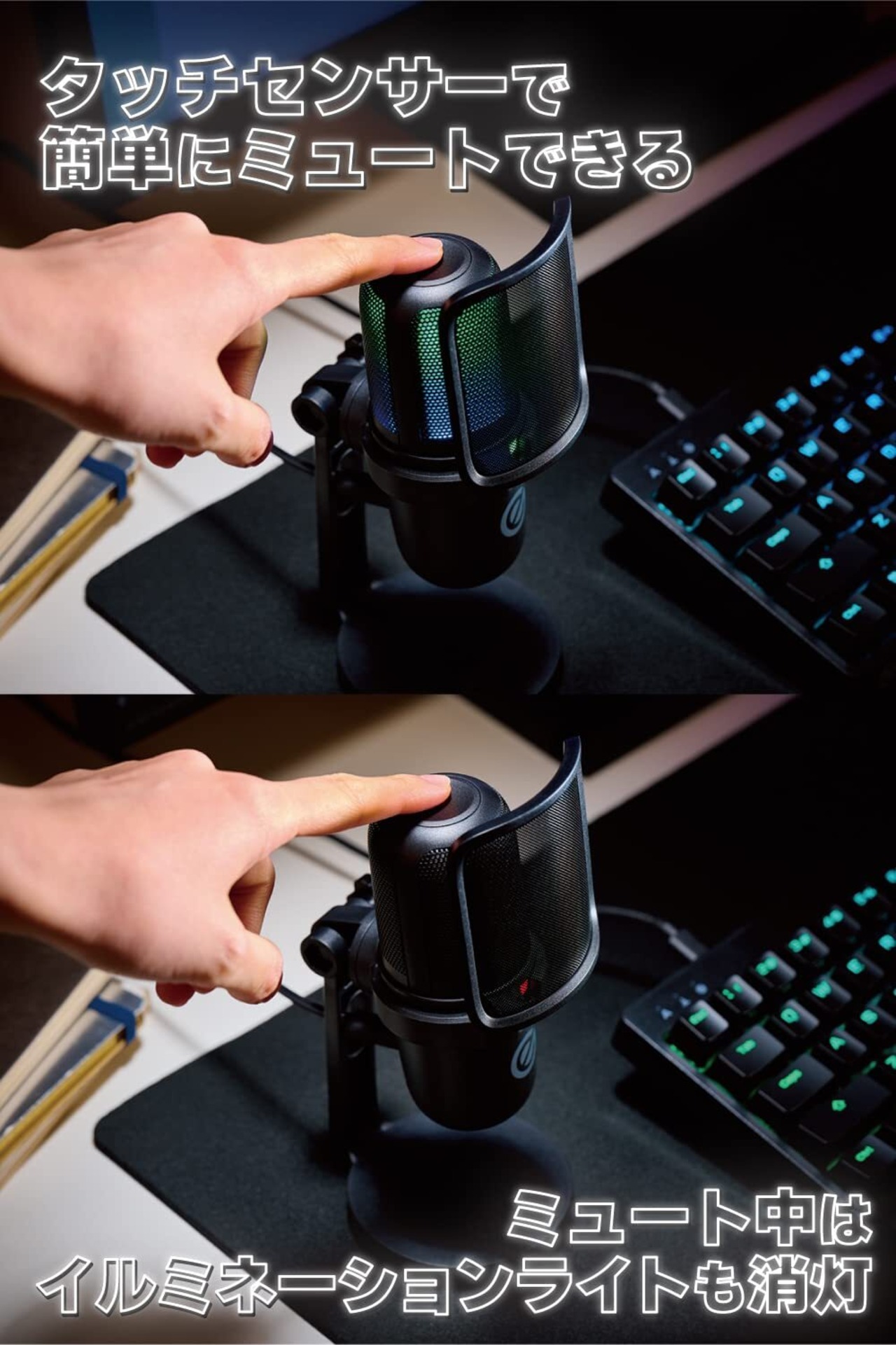 ゲーム実況・配信やプレイ中のボイスチャットで、きめ細かくクリアな音を届けたい方に。プロ仕様に近づけた、高音質・高感度のゲーミングマイクです。タッチセンサーによるマイクミュート機能、息が当たることで発生するポップノイズを防ぐガード付き。イルミネーションライトでグラデーションに光ります。