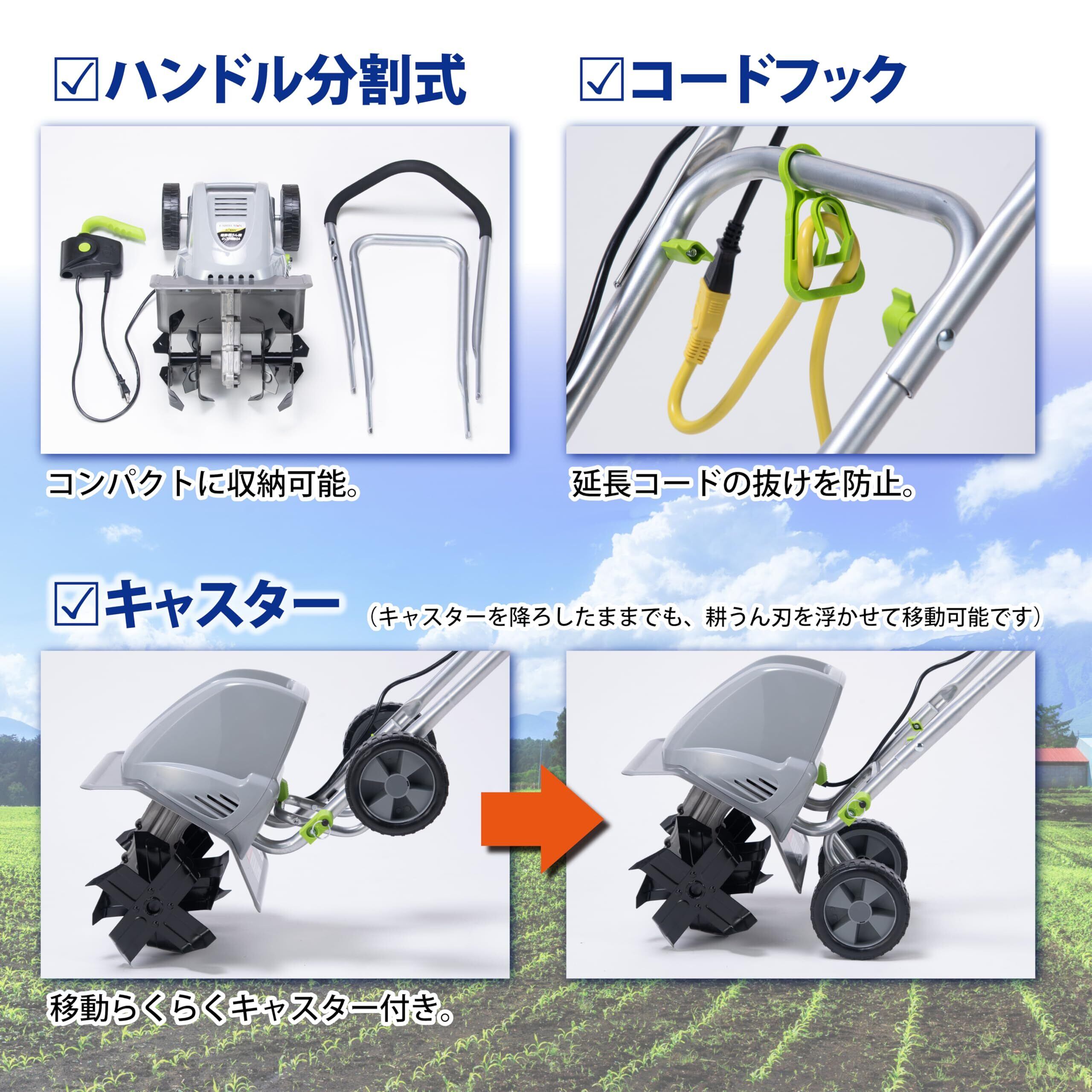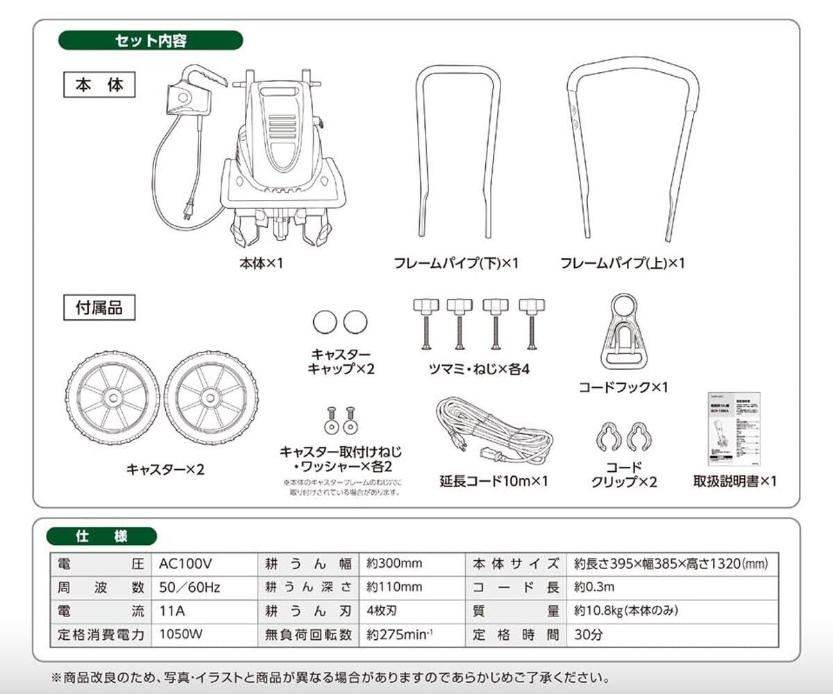 ●家庭菜園の土作りに!●AC100V家庭用電源使用。エンジンの始動や充電などの準備なしですぐに使える。●1050Wモーター。ハイパワーで作業らくらく●エンジンタイプよりも「静か」。住宅地でも使いやすい。●30分の電気代「約14円」●延長コード「10m付」●替刃式。別売の替刃に交換可能。●山型グリップ&安全ロックボタン。持ちやすく、作業しやすい山型グリップ。安全ロックボタンで誤作動を防止。●金属製ガード。丈夫で安心な金属製。●移動らくらくキャスター付。●ハンドル分割式でコンパクトに収納。●コードフック付きで延長コードの抜けを防止。●本体×1●フレームパイプ(下)×1●フレームパイプ(上)×1●キャスター×2●キャスターキャップ×2●ツマミ・ねじ×各4●コードフック×1●キャスター取付けねじ・ワッシャー×各2●延長コード10m×1●コードクリップ×2●取扱説明書×1