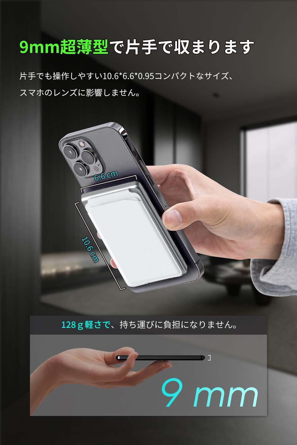 【究極の超薄型&小型】軽量で高級があるアルミニウム合金素材で作られており、耐久性を確保しながらスリムに保ちます。モバイルバッテリー magsafeはわずか0.9cmの圧倒的な薄さでスマホを充電しながら重ね持ちでとても便利です。片手で収めるほどの超小型サイズ(10.6 x 6.6 x 0.9cm)クレジットカードよりやや大きい小型サイズであり、ストレスなくiPhoneの背面に吸着します。