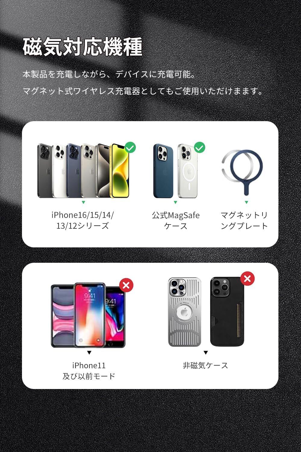 【PD20W有線と15W/7.5Wワイヤレス】iPhoneにはワイヤレス最大7.5W、Android機種に最大 15W ワイヤレス急速充電、従来のワイヤレス充電器より3倍以上速くて、充電時間を大幅に短縮します。ワイヤレス充電以外に、USB Type-Cポートは出力・入力両方対応できますので、有線でUSB-Cポート経由でデバイスに最大20Wの高速充電、iPhone15に30分で55%まで急速充電できます。(Android機種にはマグセーフ対応しないことをご了承ください。)