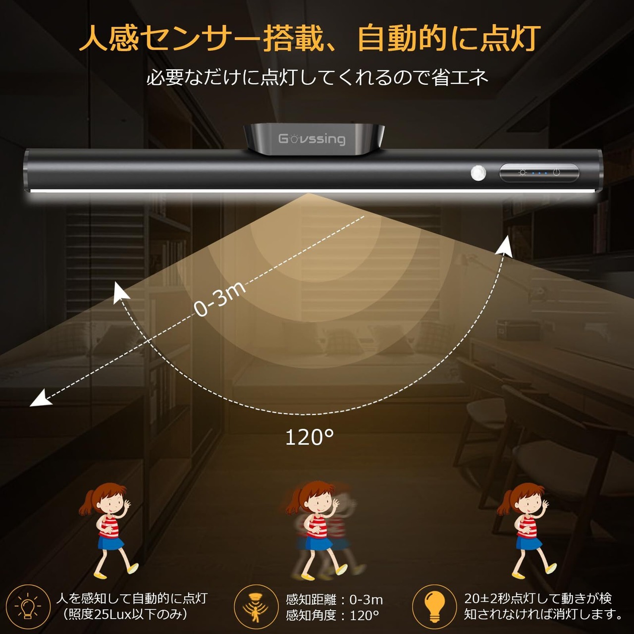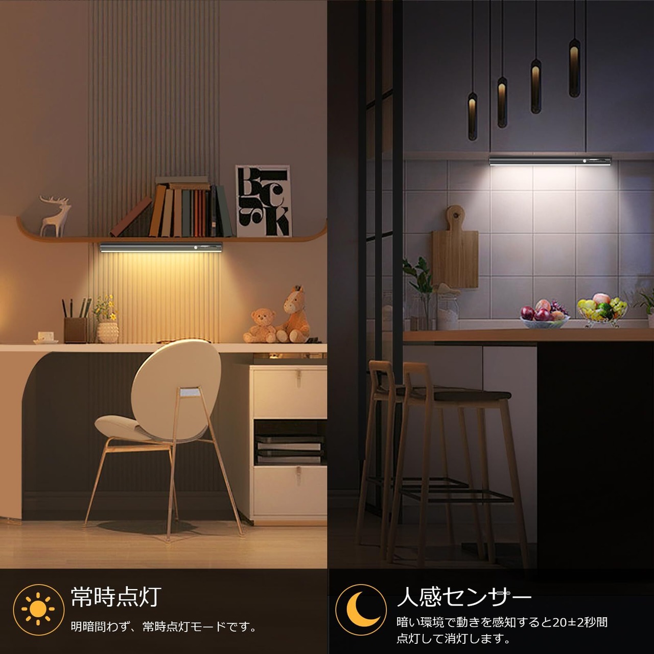 【常時点灯モードと人感センサーモード】常時点灯モードは昼夜に問わず、常時に点灯してくれるモードです。キッチンライト、デスクライトなどとしてご利用頂けます。人感センサーモードは暗い環境では感知範囲に入れば、自動的に点灯してくれます。人感センサーモードではスイッチを入れなくても自動で明かりがつくことから、帰宅時に鍵を捜したり、開錠したりする際にも便利です。センサーモードを使う時、照明の消し忘れの問題が解決できます。使っているときだけ点灯するため、省エネにも貢献できます