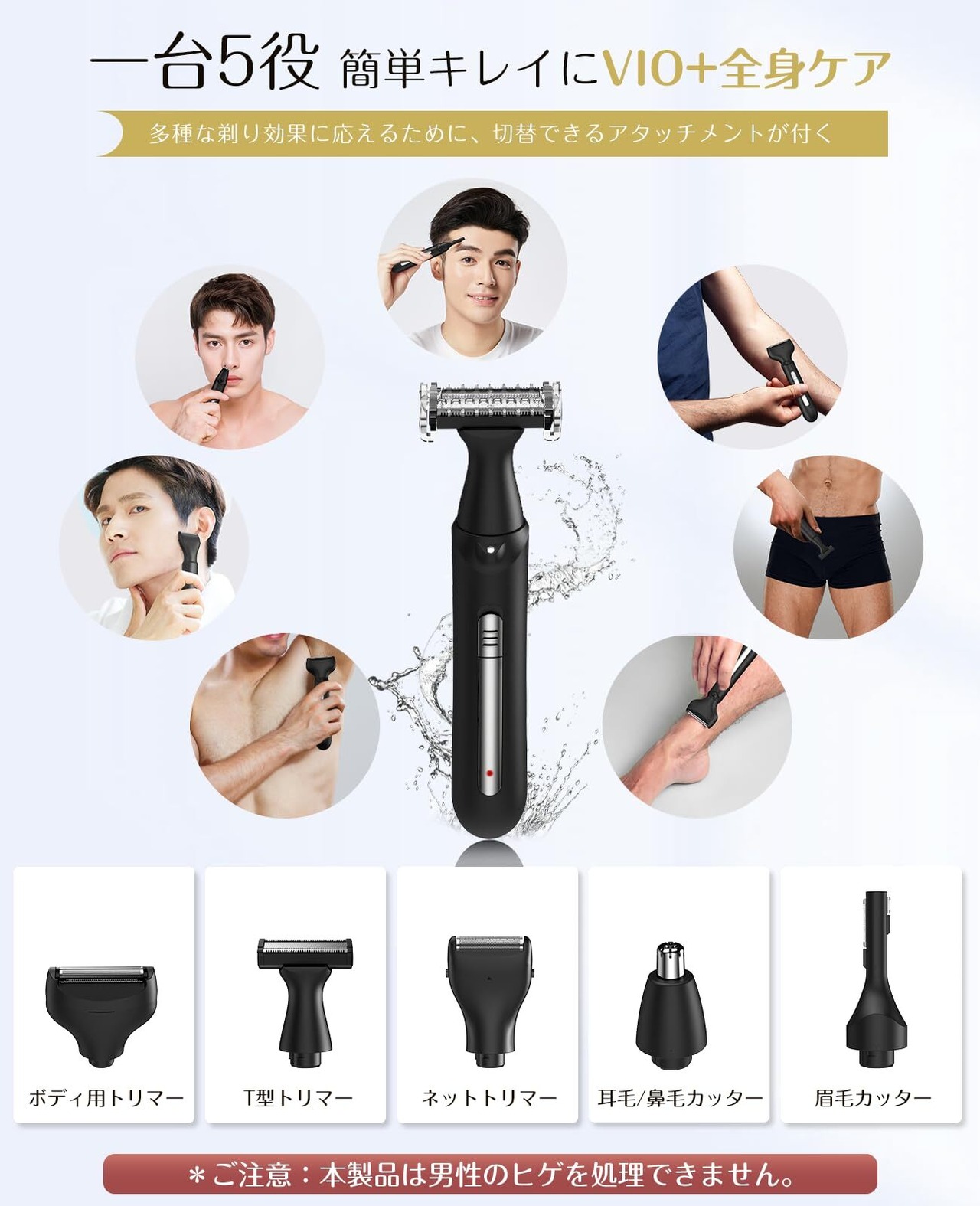 【一台5役・優しい剃り心地・初心者向き】男女兼用の電気ボディシェーバーはT型トリマー、ボディ用トリマー、ネットトリマー、眉毛シェーバー、耳毛/鼻毛シェーバーの計5種類の便利なヘッドが付属しますので、眉、鼻、耳、もみあげ、背中、脇、腕、vio、ビキニライン、すね毛、足など全身の無駄毛を自宅で手軽に整えます。抗アレルギー性精鋼ステンレス材質で、肌が弱い方にも安心してご使用できます。0.1mm-5mmの長さを調整できるアタッチメントも付属しており、組み合わせて使うことで初心者でも理想的な毛量、素敵なVIOと全身ケアを実現できます。