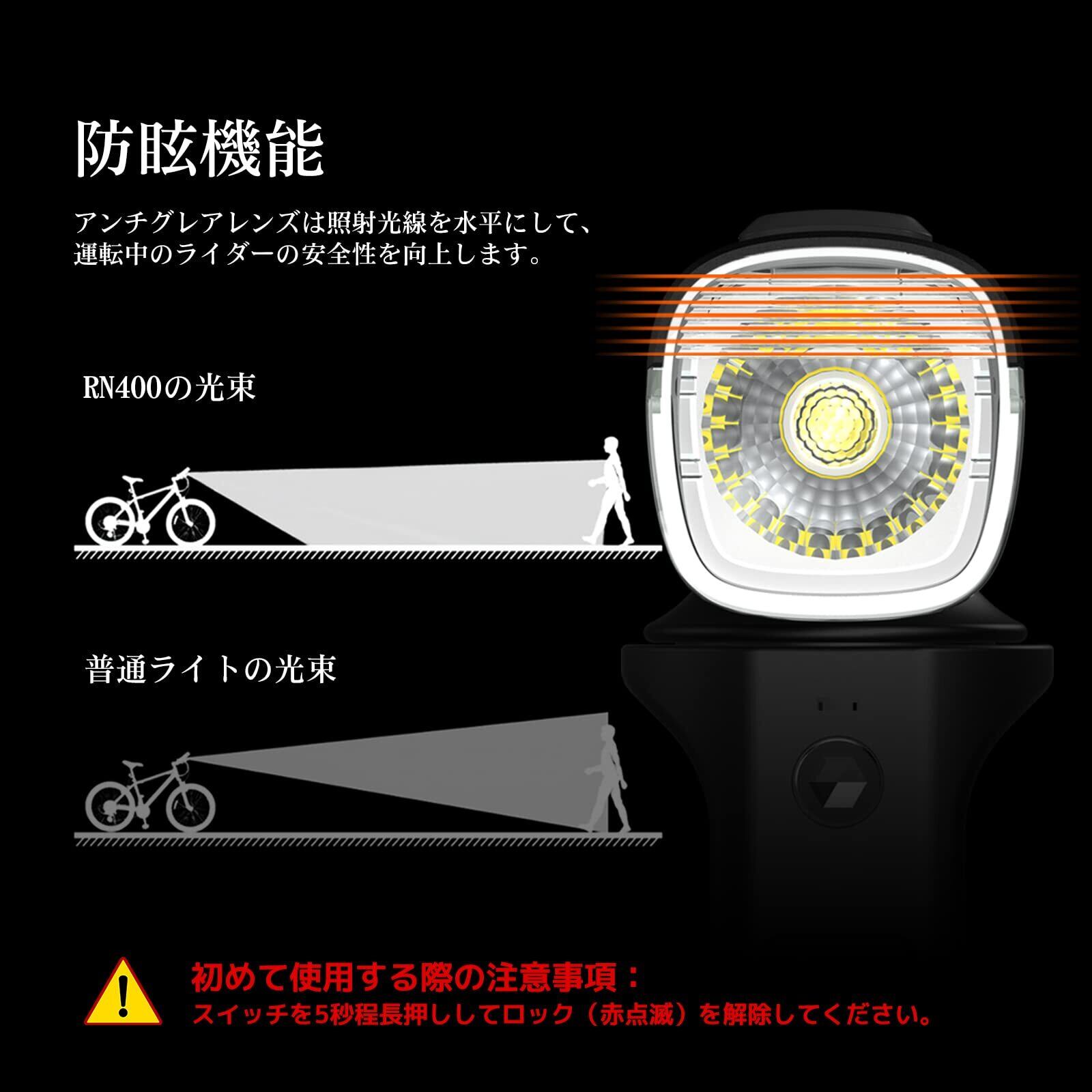[初めてご使用上の注意&防眩機能] 注意:使用する前にまずスイッチのLEDが赤点滅から緑になるまで5秒間ぐらい長押ししてロック状態を解除してから、再び2秒ぐらい押すと正常的に点灯します。RN400のアンチグレアレンズは照射光線を水平にして、運転中のライダーや歩行者の安全性を向上します。また、最大400ルーメンの明るさで作動し、横側に指示ランプが搭載され、側面の視認性も実現し、夜間走行の安全も確保できます