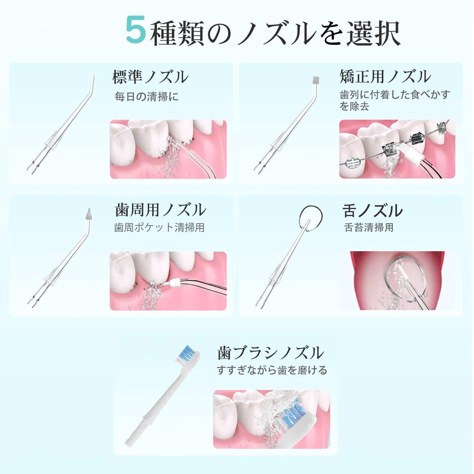 ジェットウォッシャー :効果的な洗浄、強力な水流で歯間の汚れや食べかすを除去し、歯を白く清潔に保ちます。