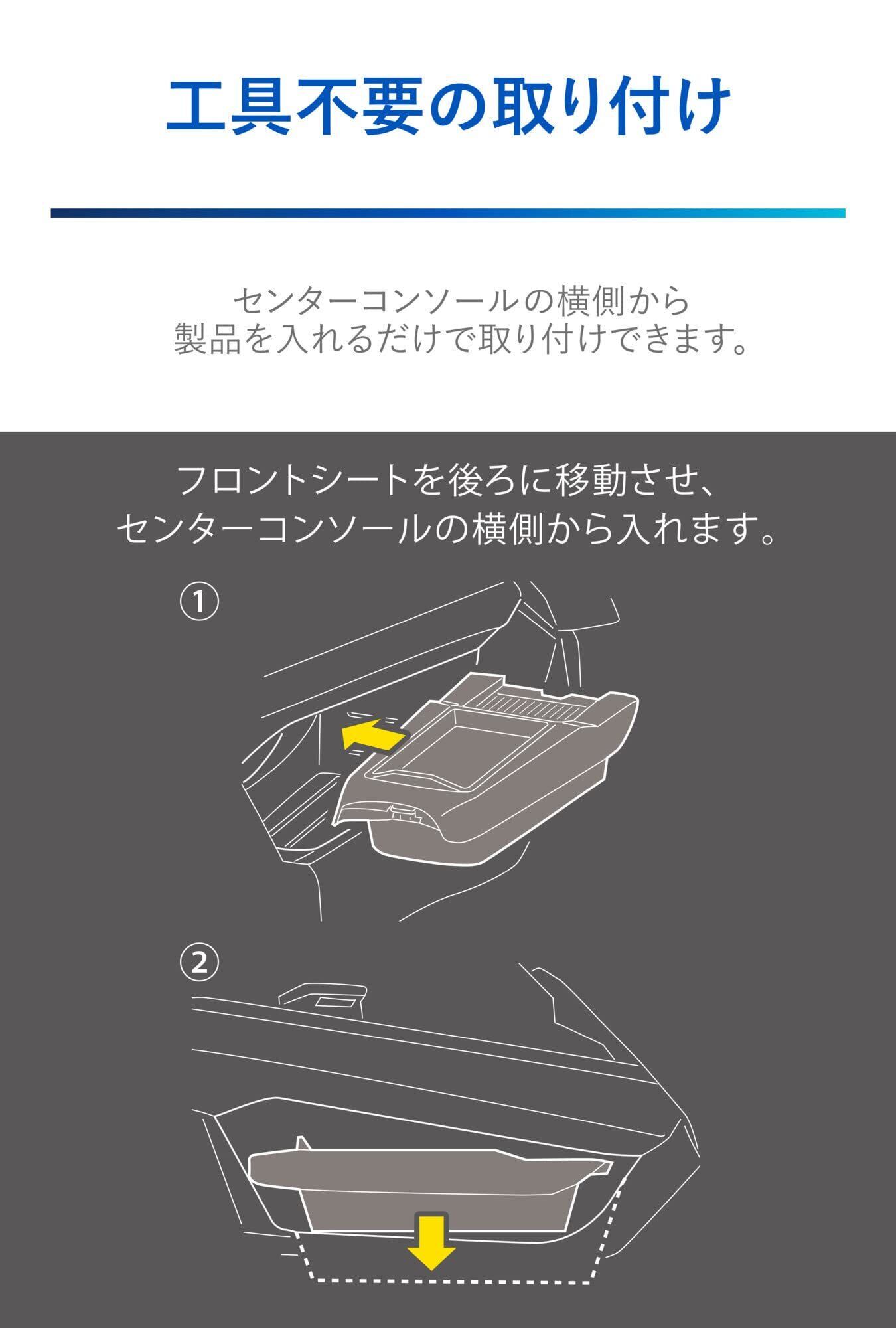 【工具不要で簡単な取り付け】フロントシートを後ろに移動させ、センターコンソールの横側から製品を入れるだけで取り付けできます。製品底面にはスポンジシートを備え、製品のがたつきを防止します。走行中のがたつきやカタカタ音を防ぎ、快適に過ごせます。
